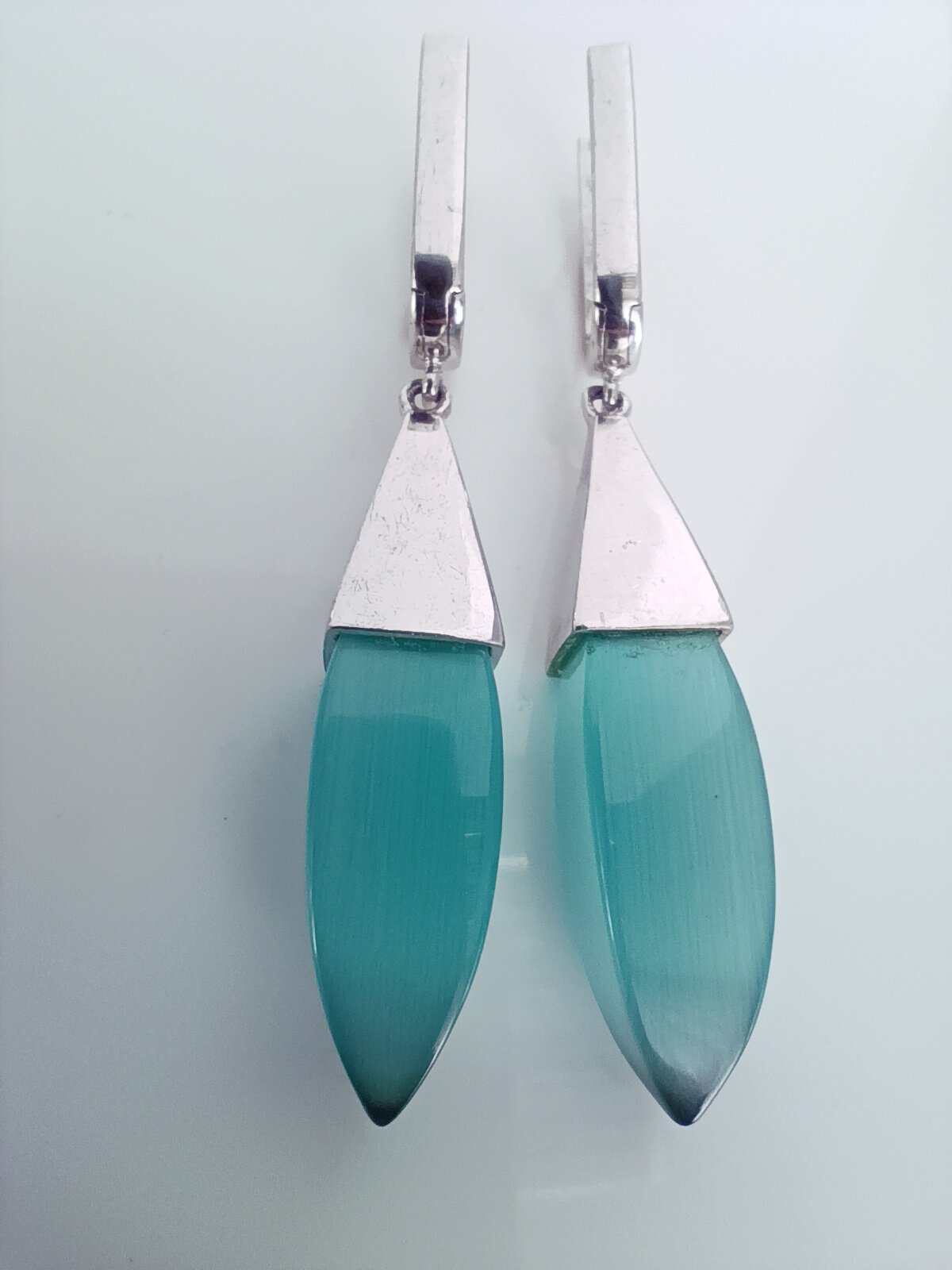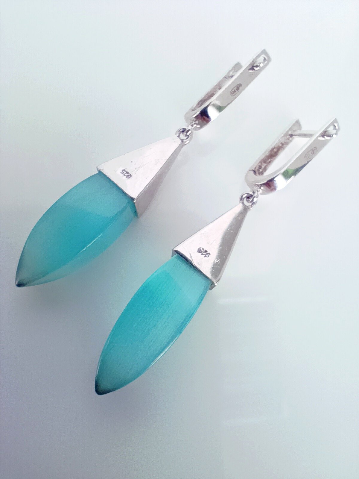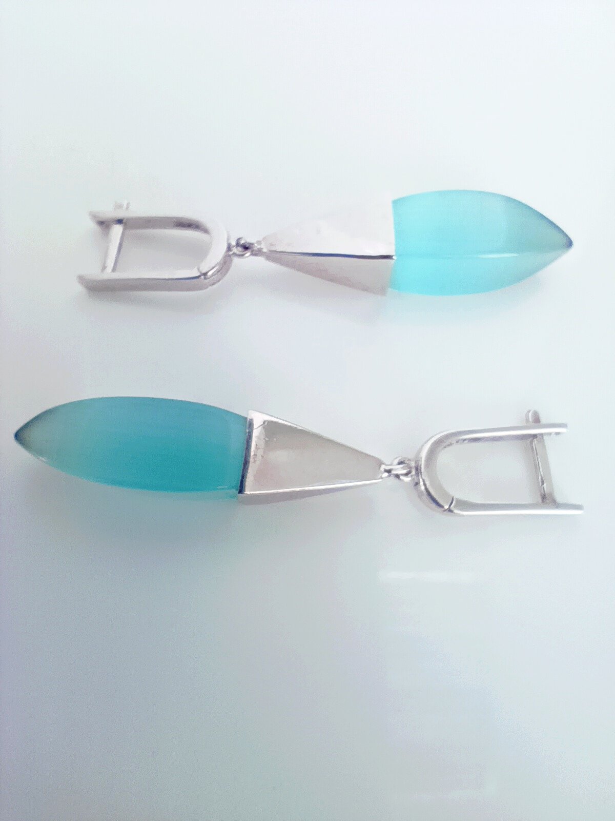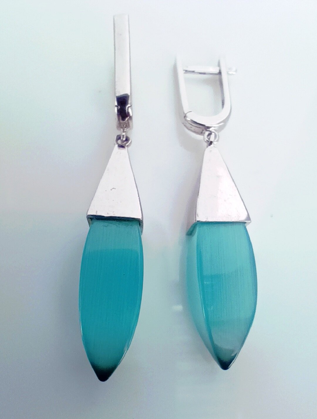 Серьги "Эстерелла" имеют подвески в виде бриолетов, выполненных из кварца. Цвет вставок - бирюзовый, что придает украшению морской оттенок.