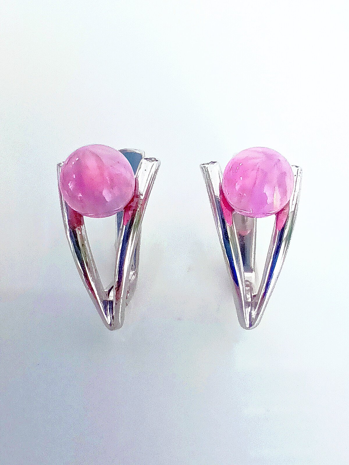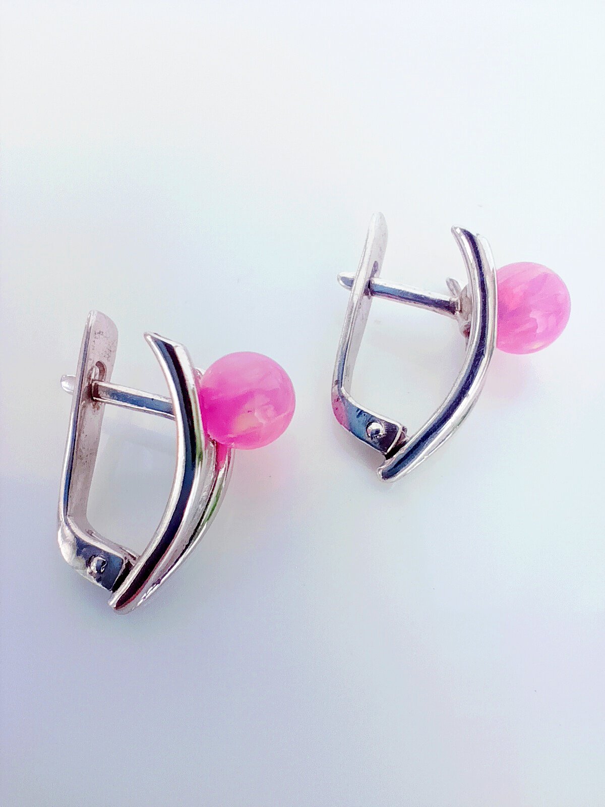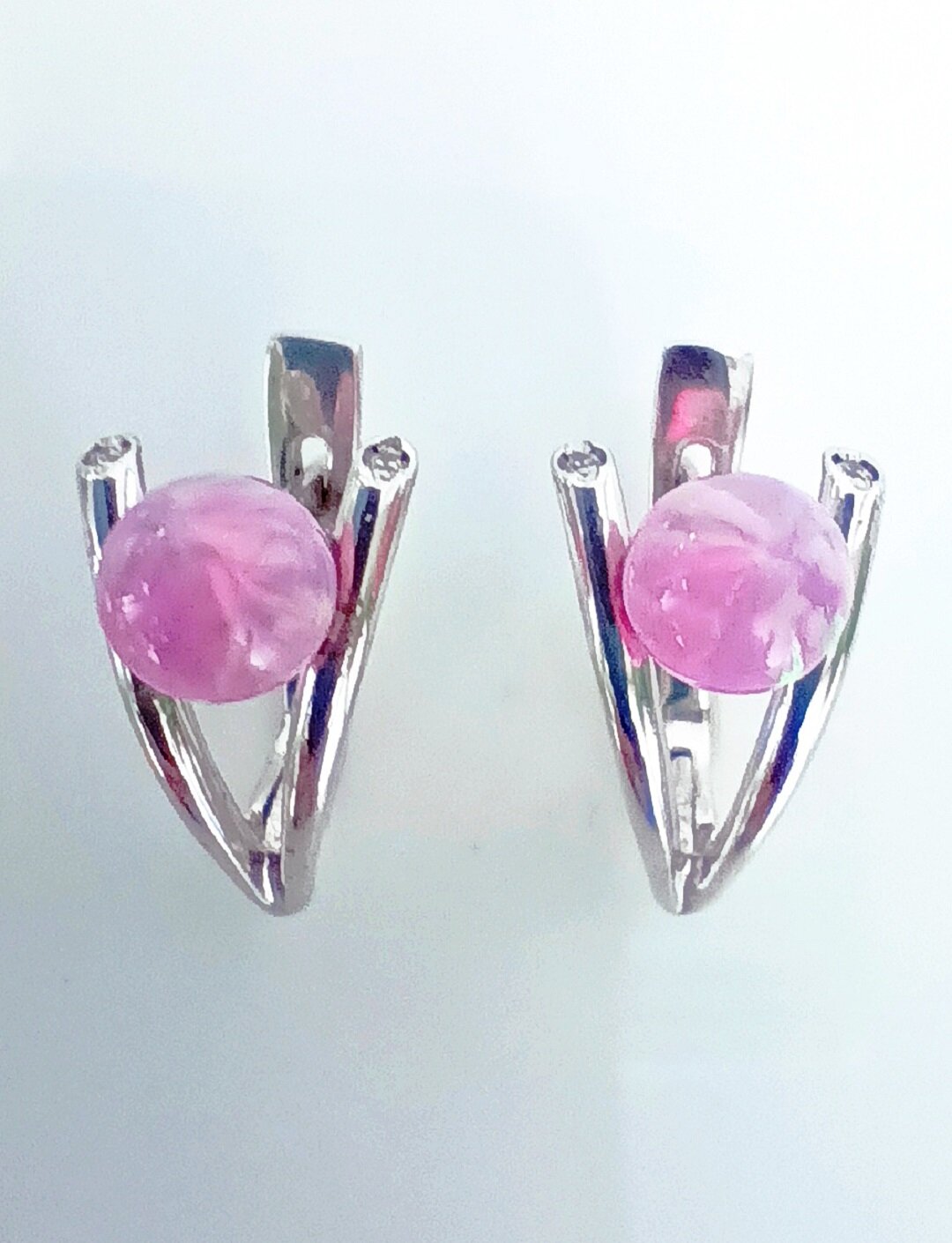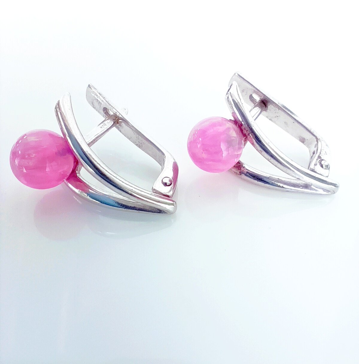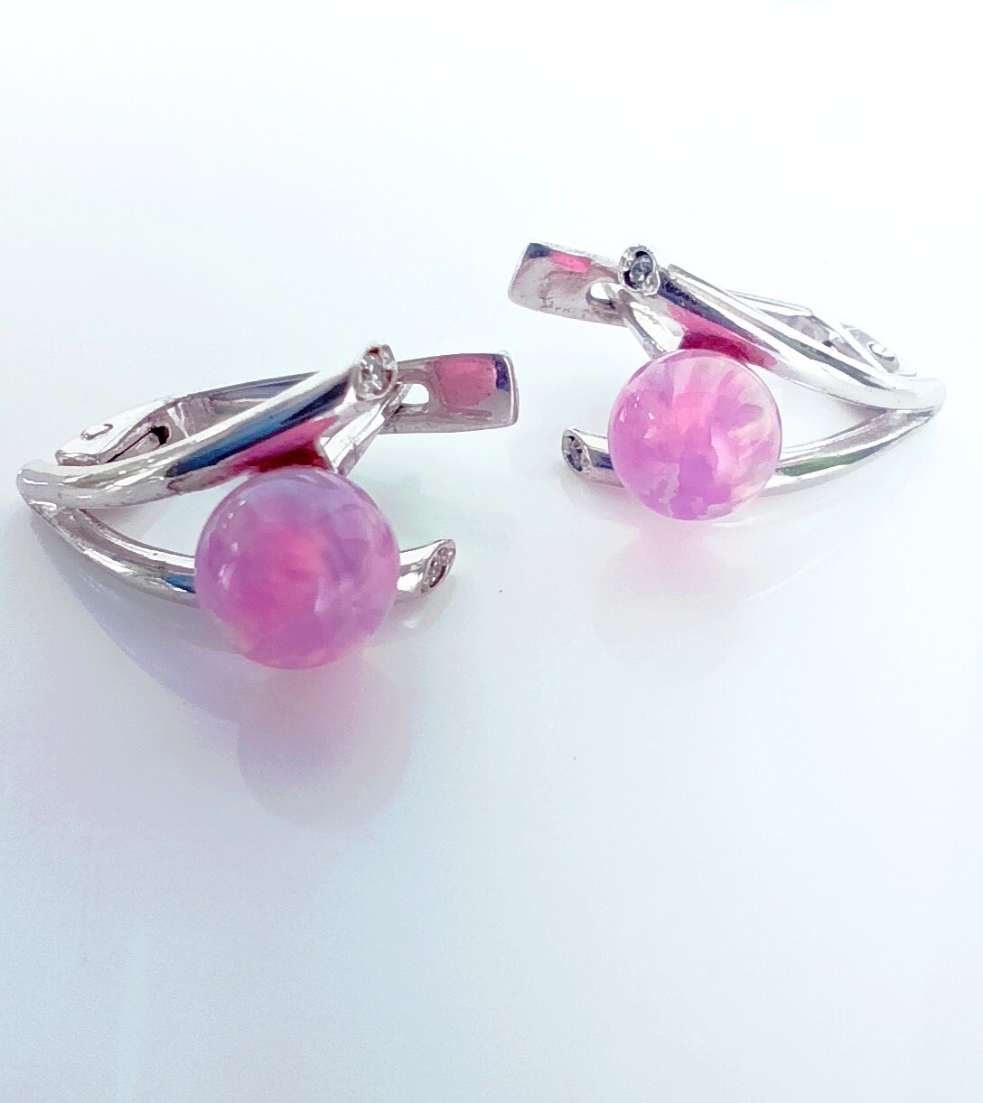 Опал синтетический и фианит в качестве вставок придают серьгам неповторимый блеск и сияние. Цвет вставок - фуксия и белый, что делает украшение ярким и заметным.