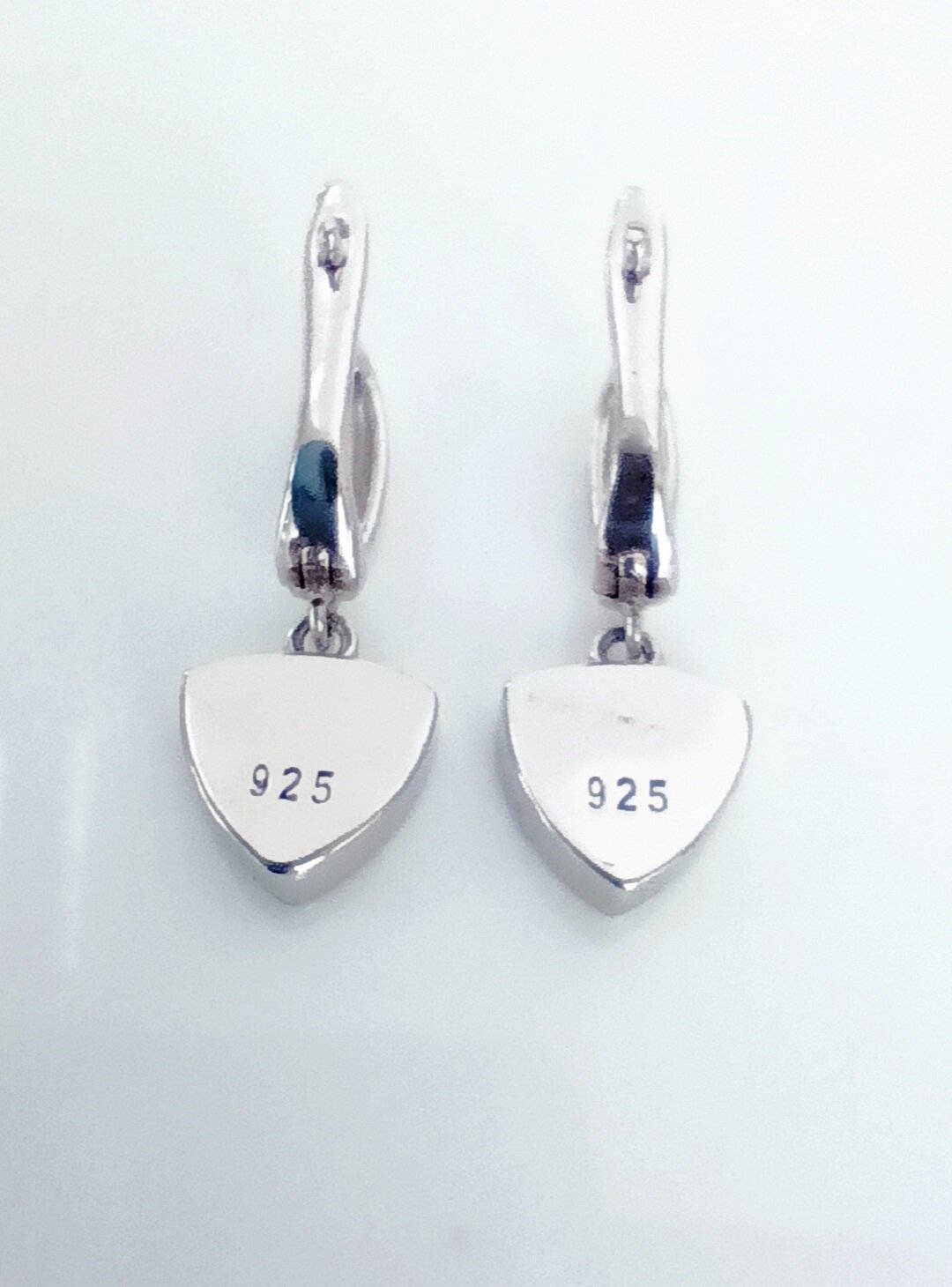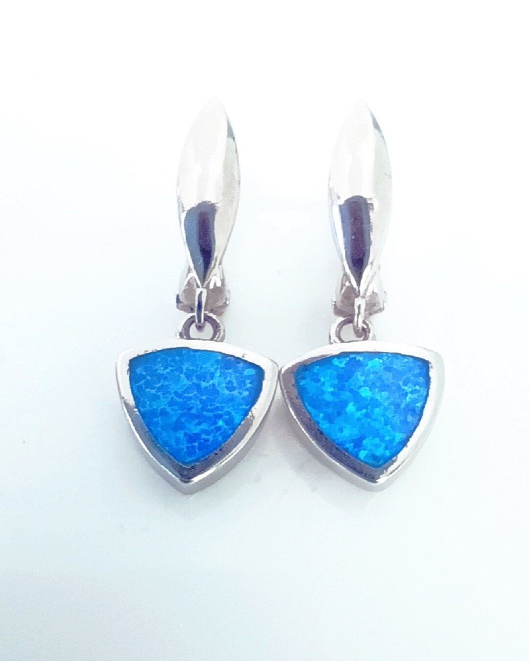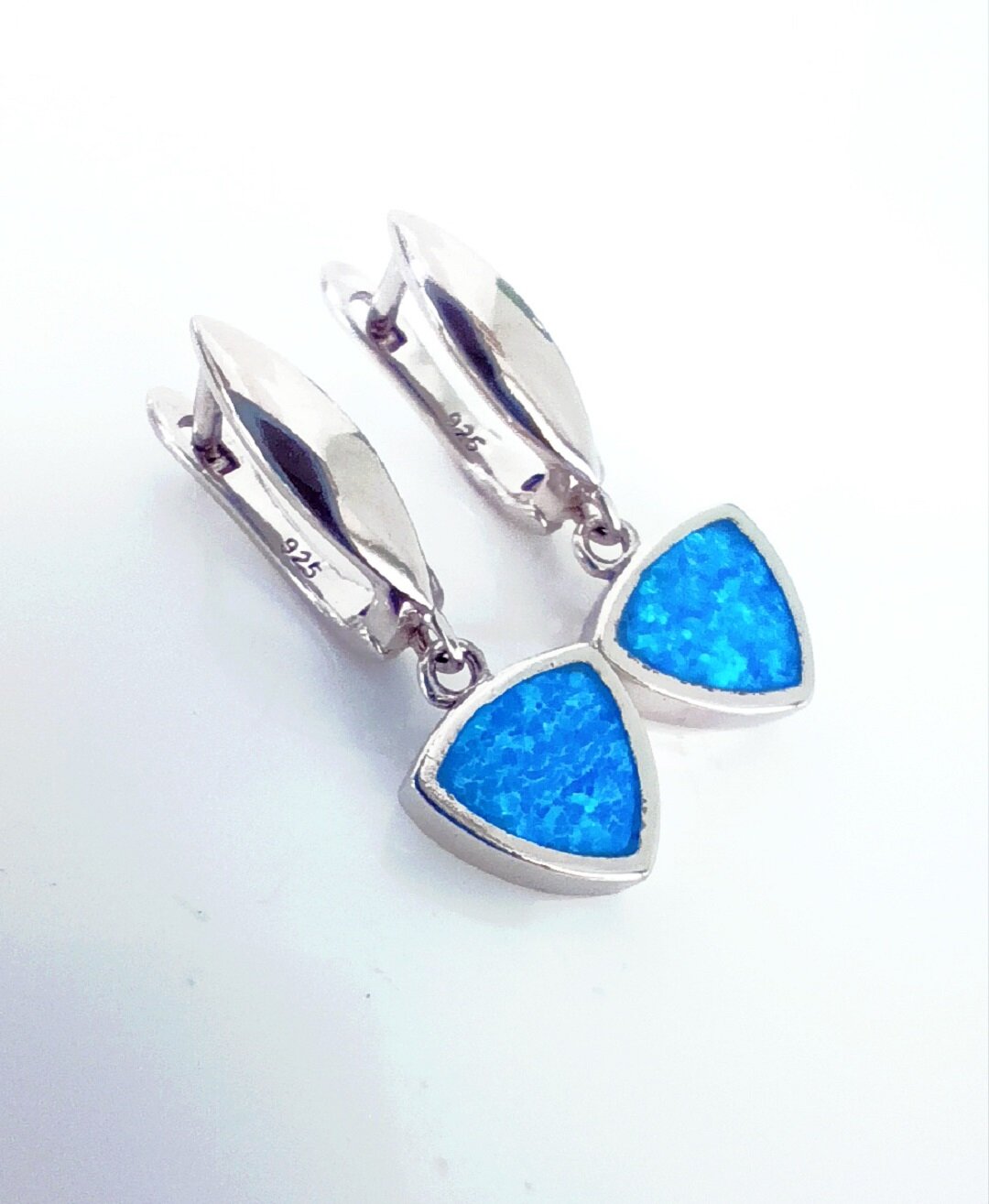 Вставка из синтетического опала в форме триллиона придает серьгам яркий и насыщенный мультиколор оттенок. Цвет вставки переливается и меняется в зависимости от освещения, создавая эффект игры света и тени.