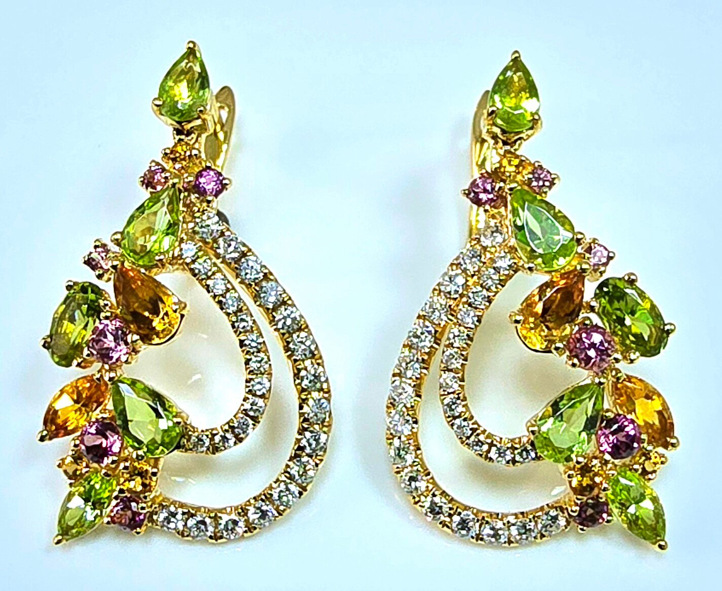 Бриллианты, турмалины, цитрины и хризолиты, использованные в дизайне, придают серьгам неповторимый блеск и очарование. Эти драгоценные камни добавляют изделию роскоши и элегантности, делая его поистине уникальным.