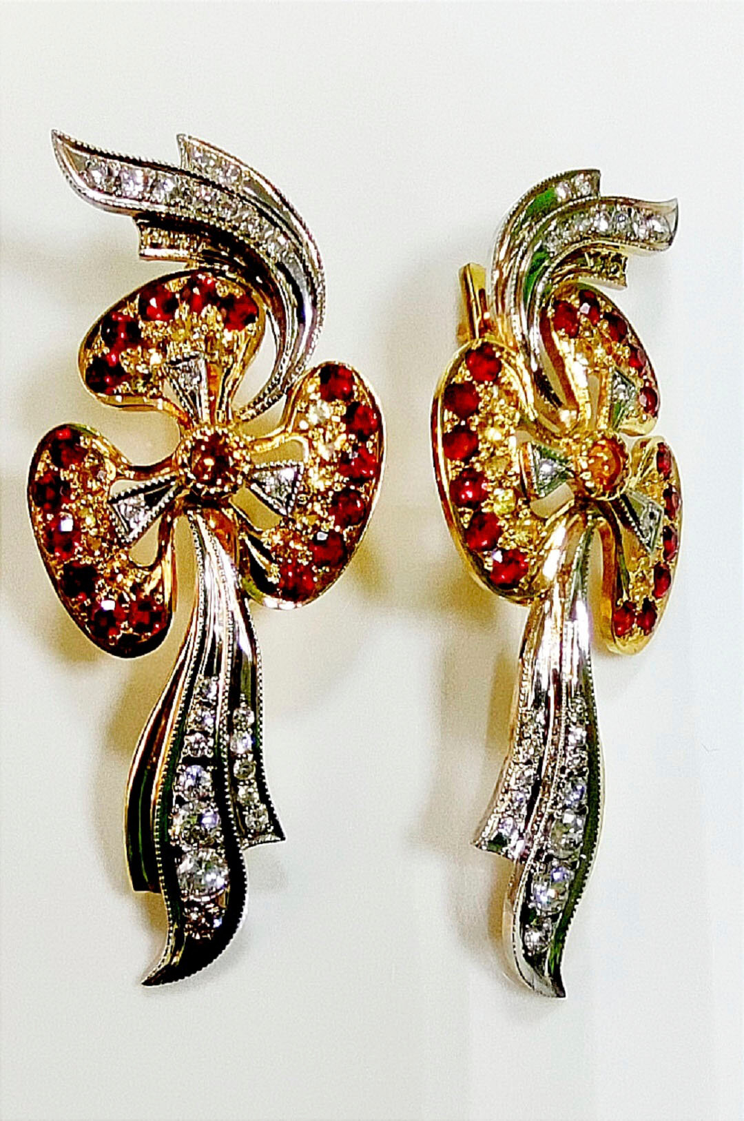 Серьги ручной работы из золота 750 пробы с бриллиантами, красными и жёлтыми сапфирами.