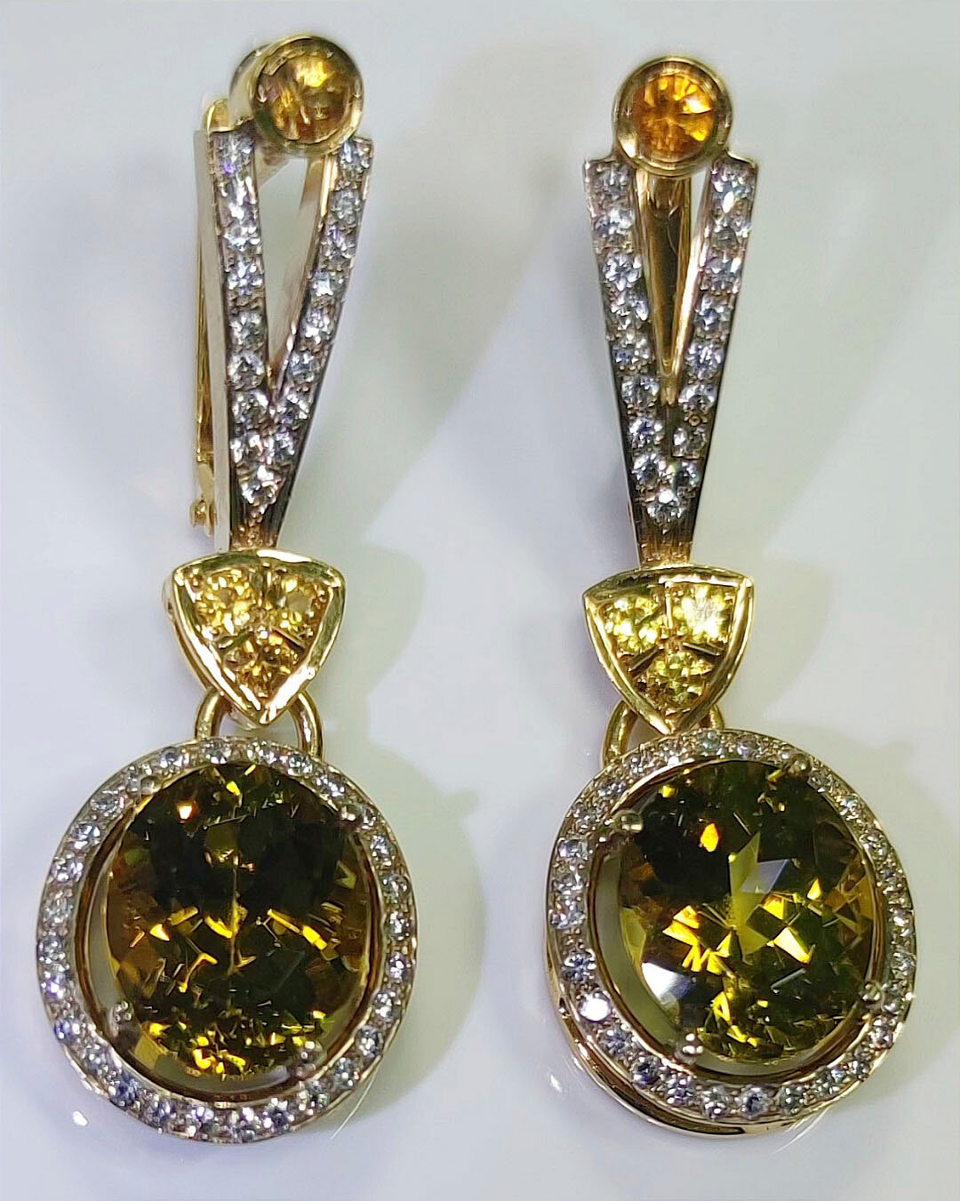 Серьги ручной работы в единственном экземпляре. Изготовлены из золота 750 пробы с крайне редкими гроссулярами высокого качества, дополненными жёлтыми сапфирами и бриллиантами.