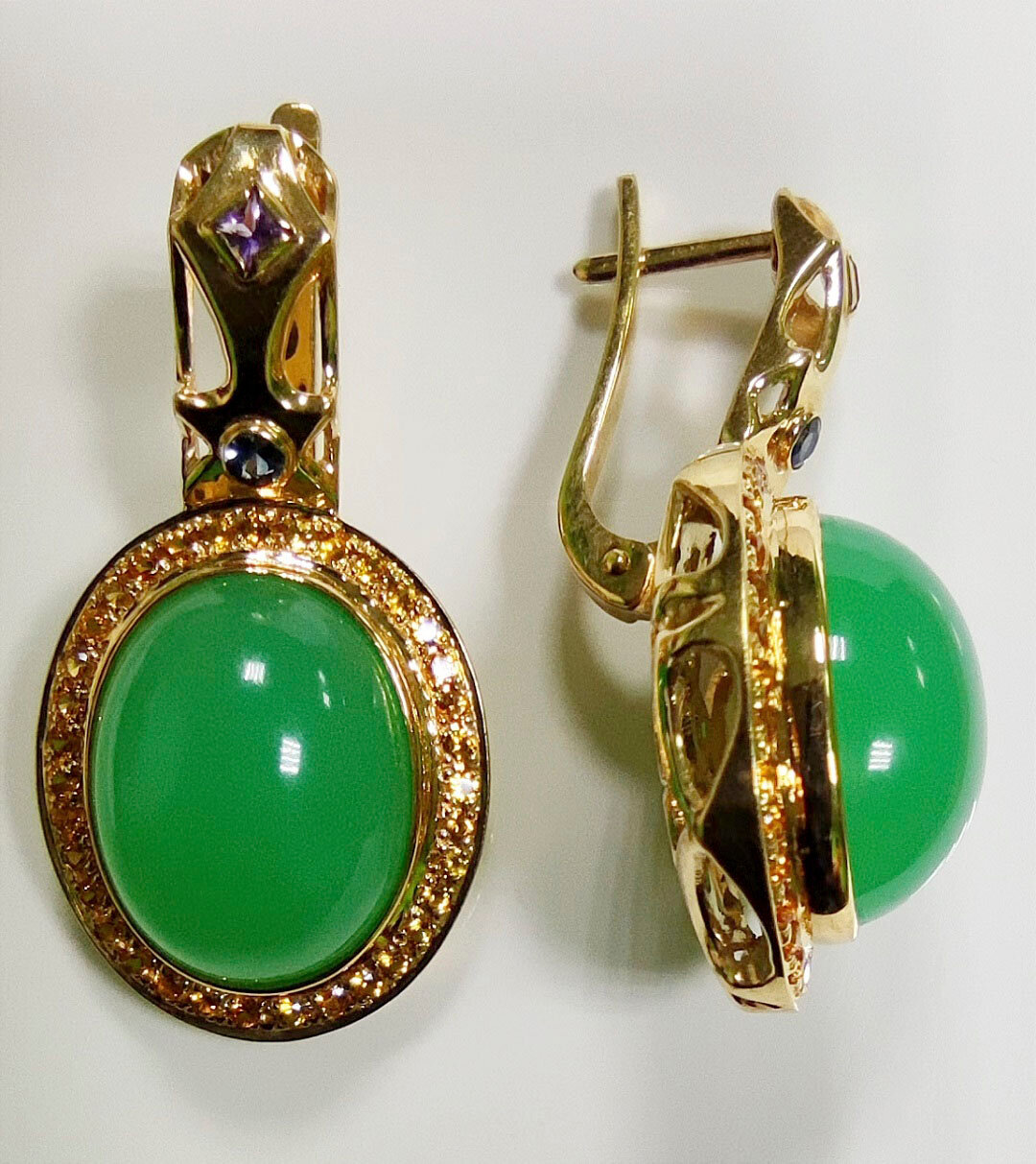 Эксклюзивные серьги ручной работы, выполнены в единственном экземпляре. Вставка - высочайшего качества хризопраз, синие и жёлтые сапфиры, аметист. Серьги сделаны из золота 750 пробы.