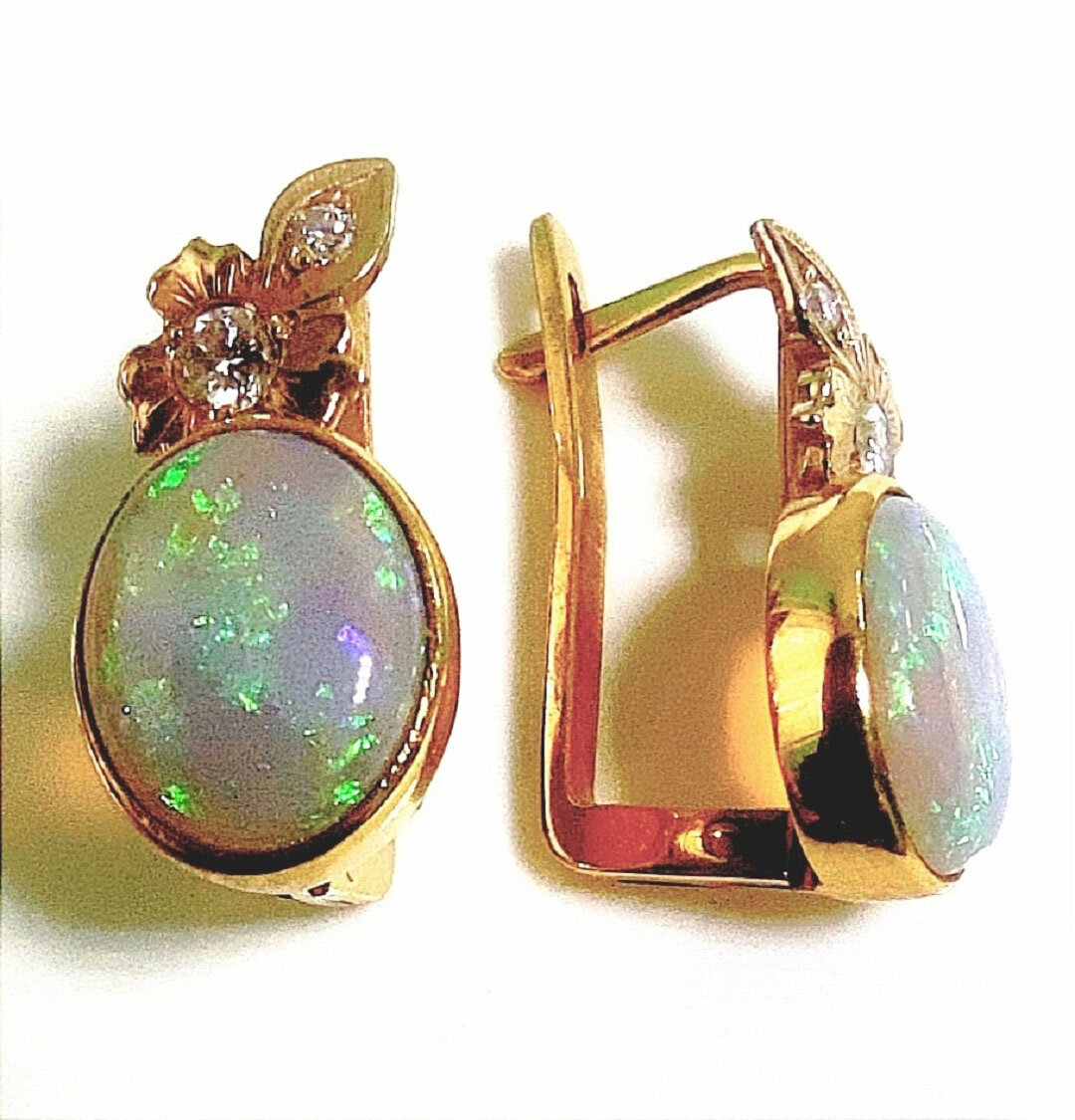 Серьги ручной работы в единственном экземпляре. Изготовлены из золота 750 пробы с австралийскими опалами и бриллиантами