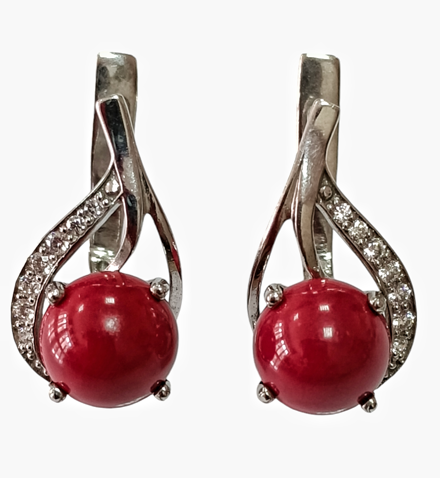 Серьги украшены вставками из коралла синтетического красного цвета и фианитов. Коралл синтетический имеет диаметр 8 мм и форму круга, что придает украшению особый шарм и элегантность. Фианиты добавляют блеск и сияние, делая серьги еще более привлекательными.