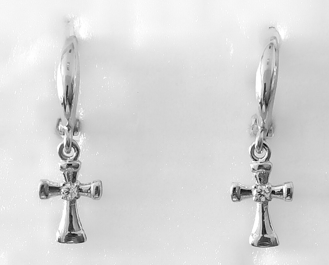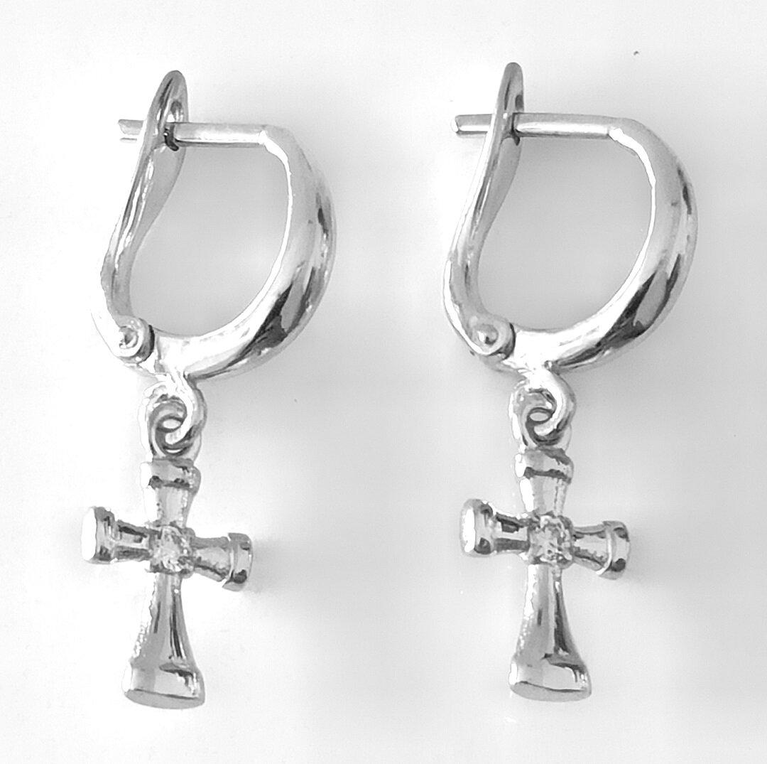 Модель серег с подвесками и вставками из фианита круглой формы. Фианит - это синтетический камень, который обладает ярким блеском и долговечностью.