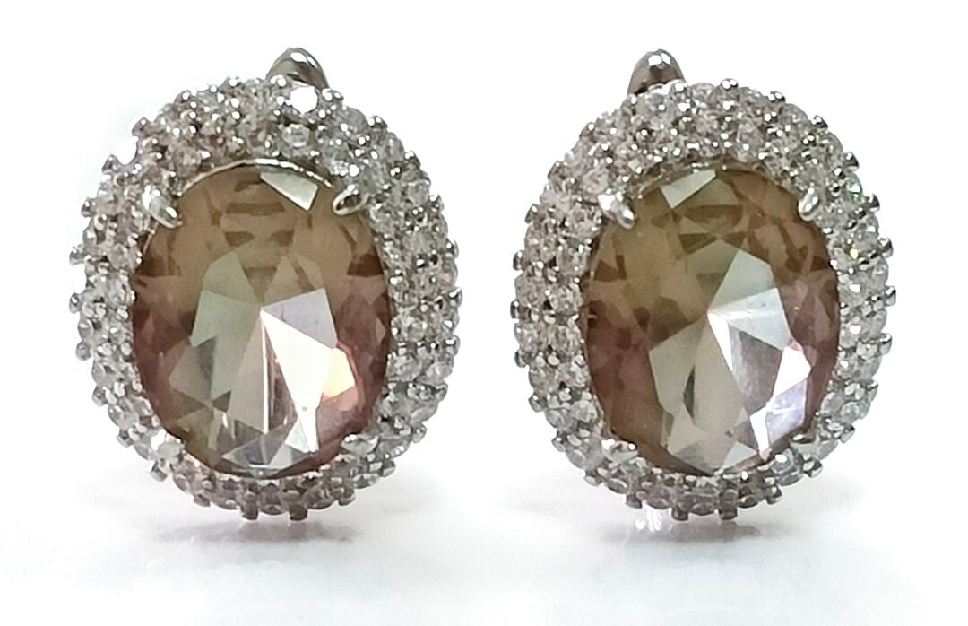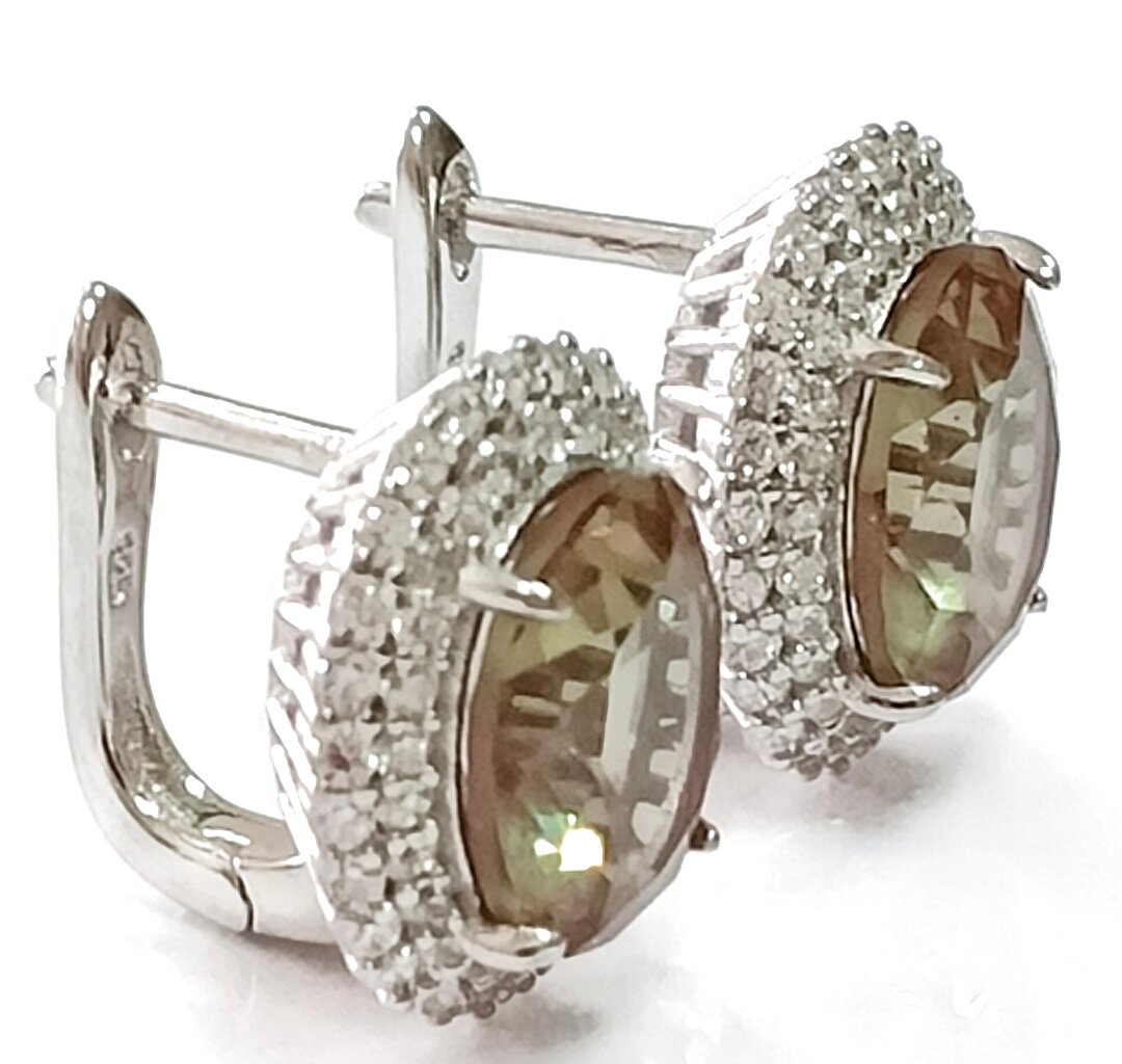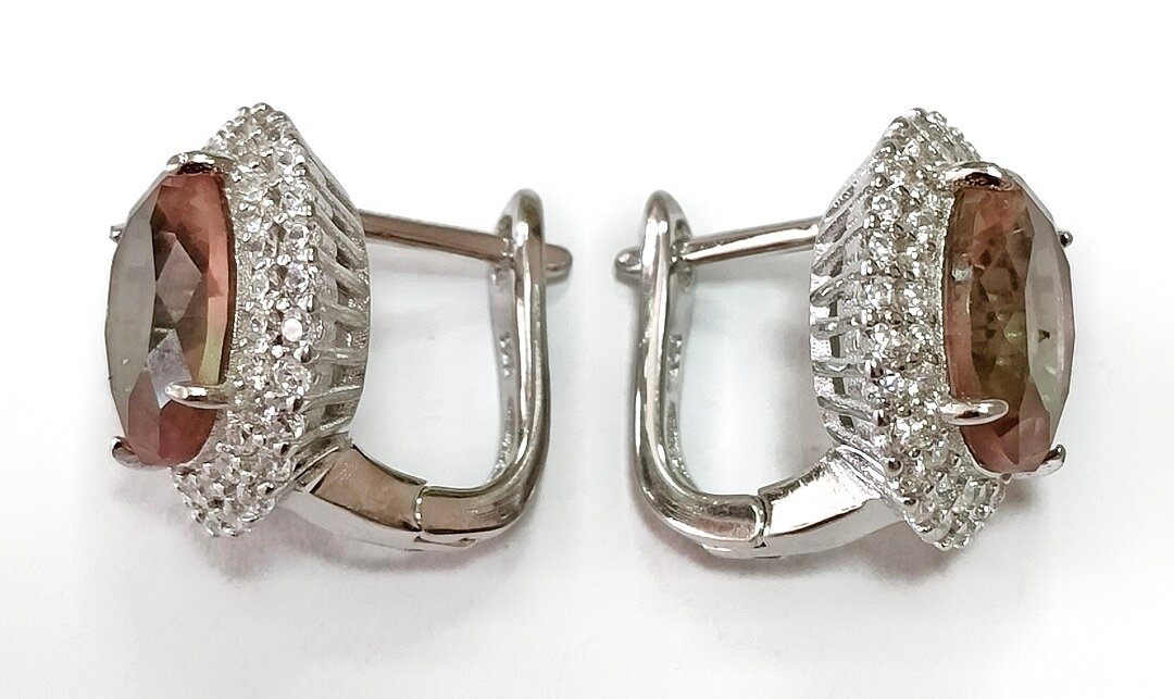 Вставка из натурального камня султанита придает серьгам особый шарм и уникальность. Султанит – это синтетический камень, который обладает уникальными оптическими свойствами и способен менять свой цвет в зависимости от освещения.
