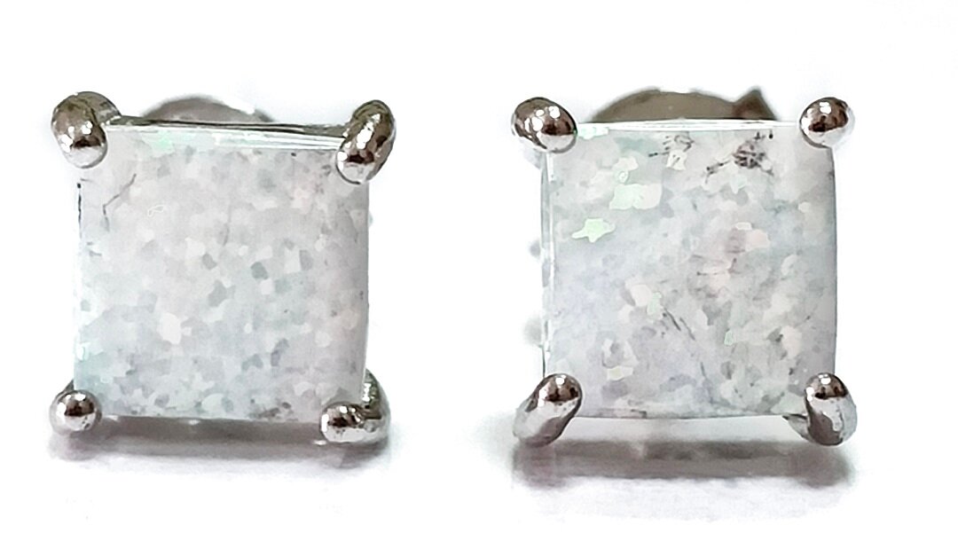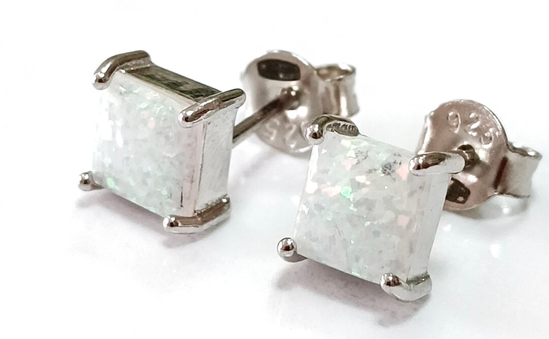 Вставка из белого синтетического опала квадратной формы придает серьгам особый шарм и изысканность. Размер украшения составляет 1,5 см, а диаметр - 6,0 см.