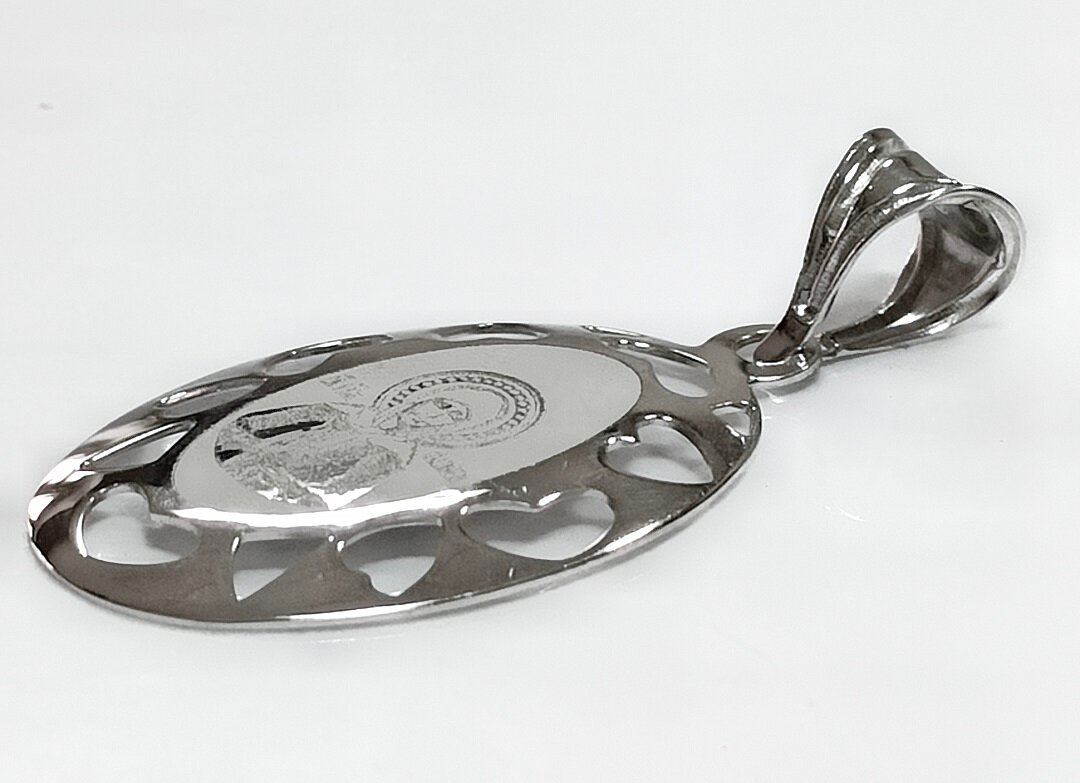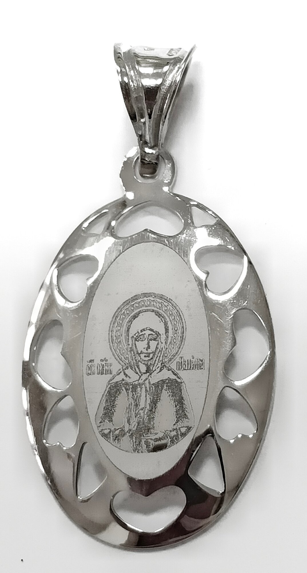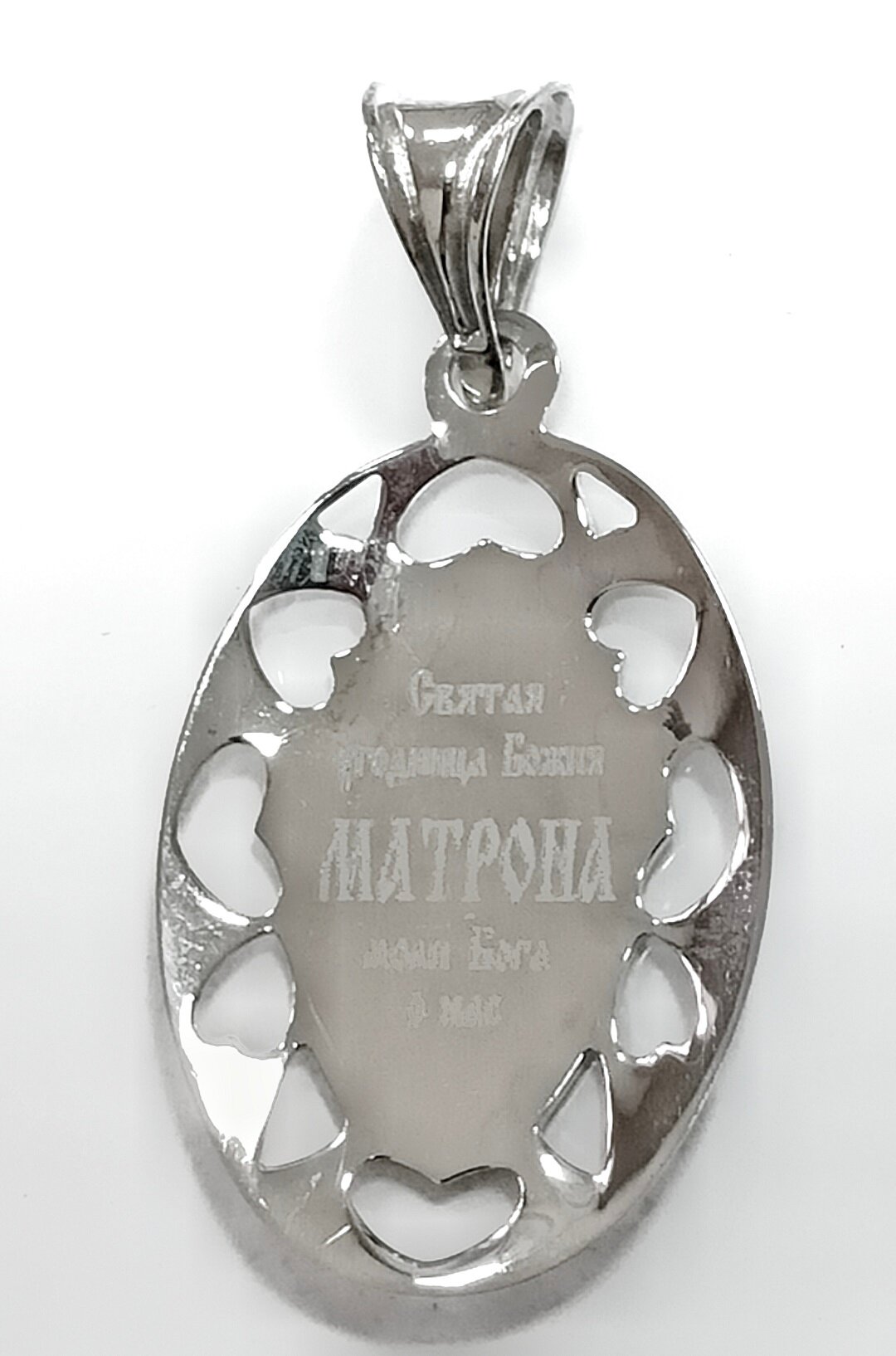 Подвеска "Святая Матрона" выполнена с отделкой родированием, что придает ей блеск и защищает от царапин и потертостей.