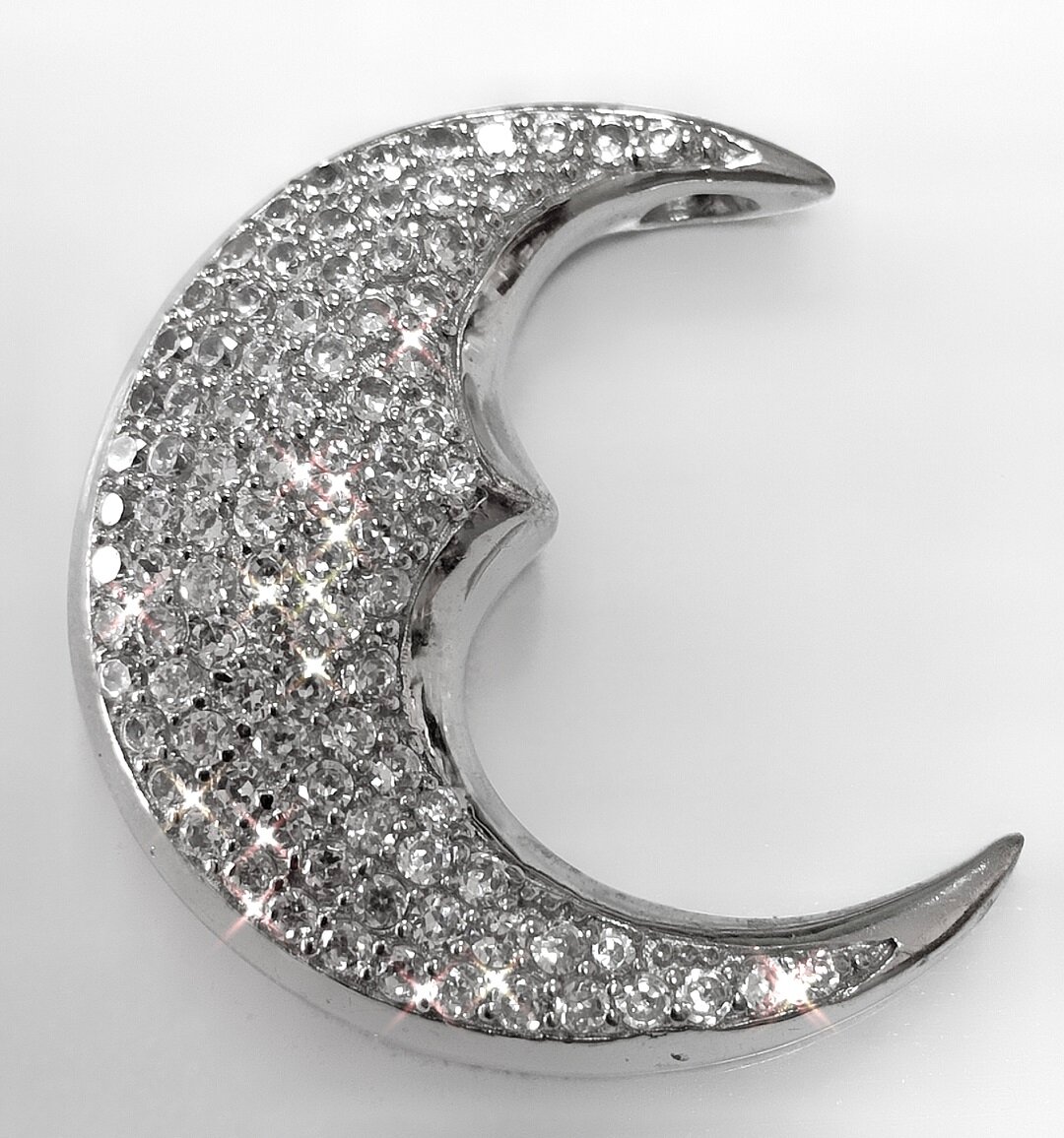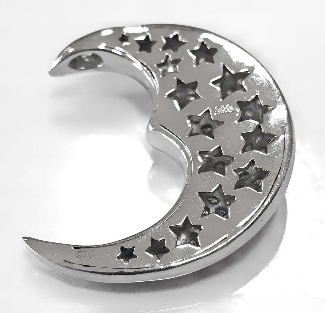 Украшение выполнено в виде полумесяца с фианитовой вставкой, что придает ему неповторимый блеск и сияние.