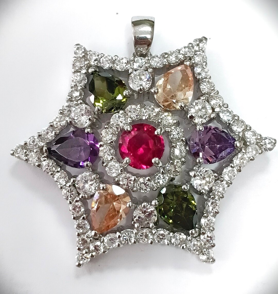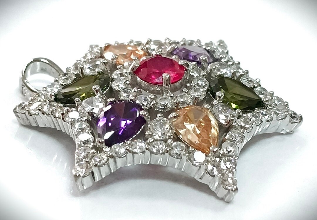 Подвеска Эстерелла выполнена из серебра 925 пробы с родиевым покрытием, что обеспечивает долговечность и защиту от царапин. Средний вес изделия составляет 9,88 грамма, что делает его легким и комфортным для ношения.