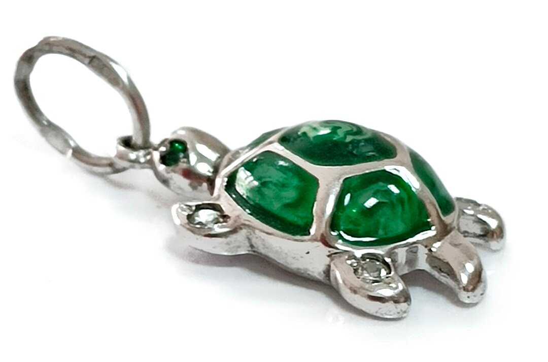 Подвеска украшена зеленой эмалью, которая придает изделию неповторимый и яркий вид. Отделка подвески - родирование, что обеспечивает защиту от царапин и придает украшению блеск и сияние.