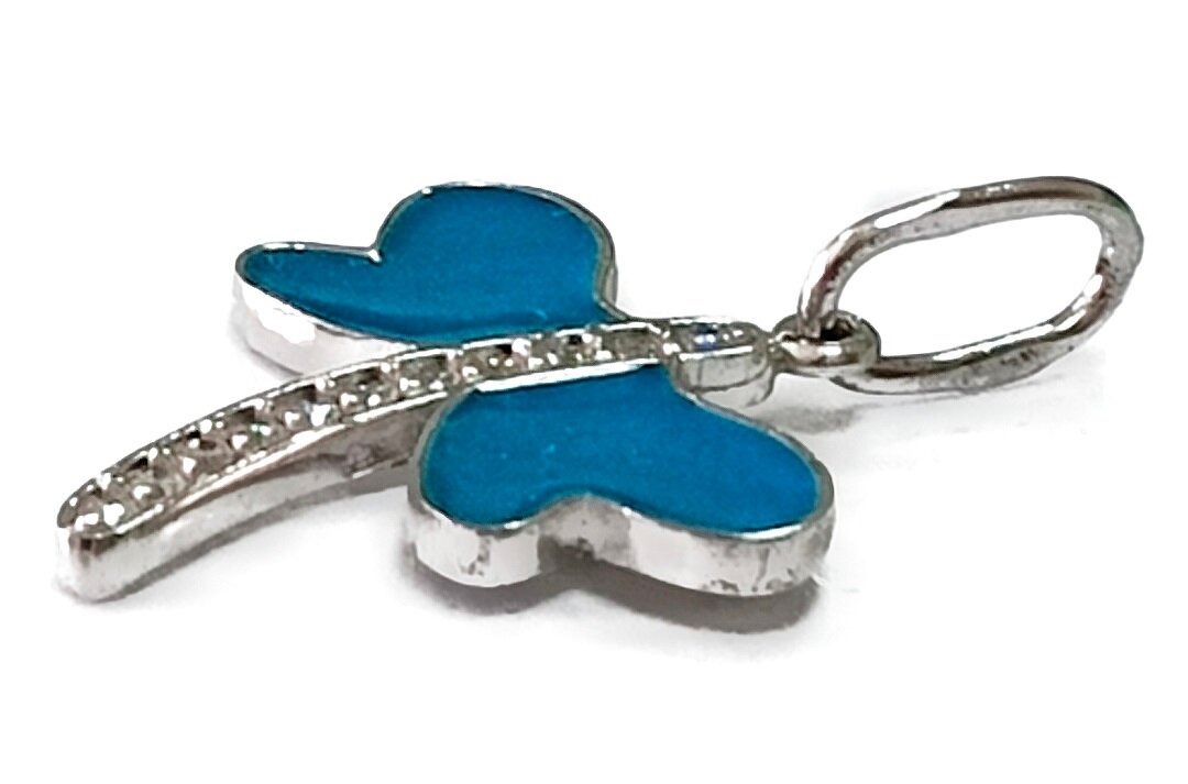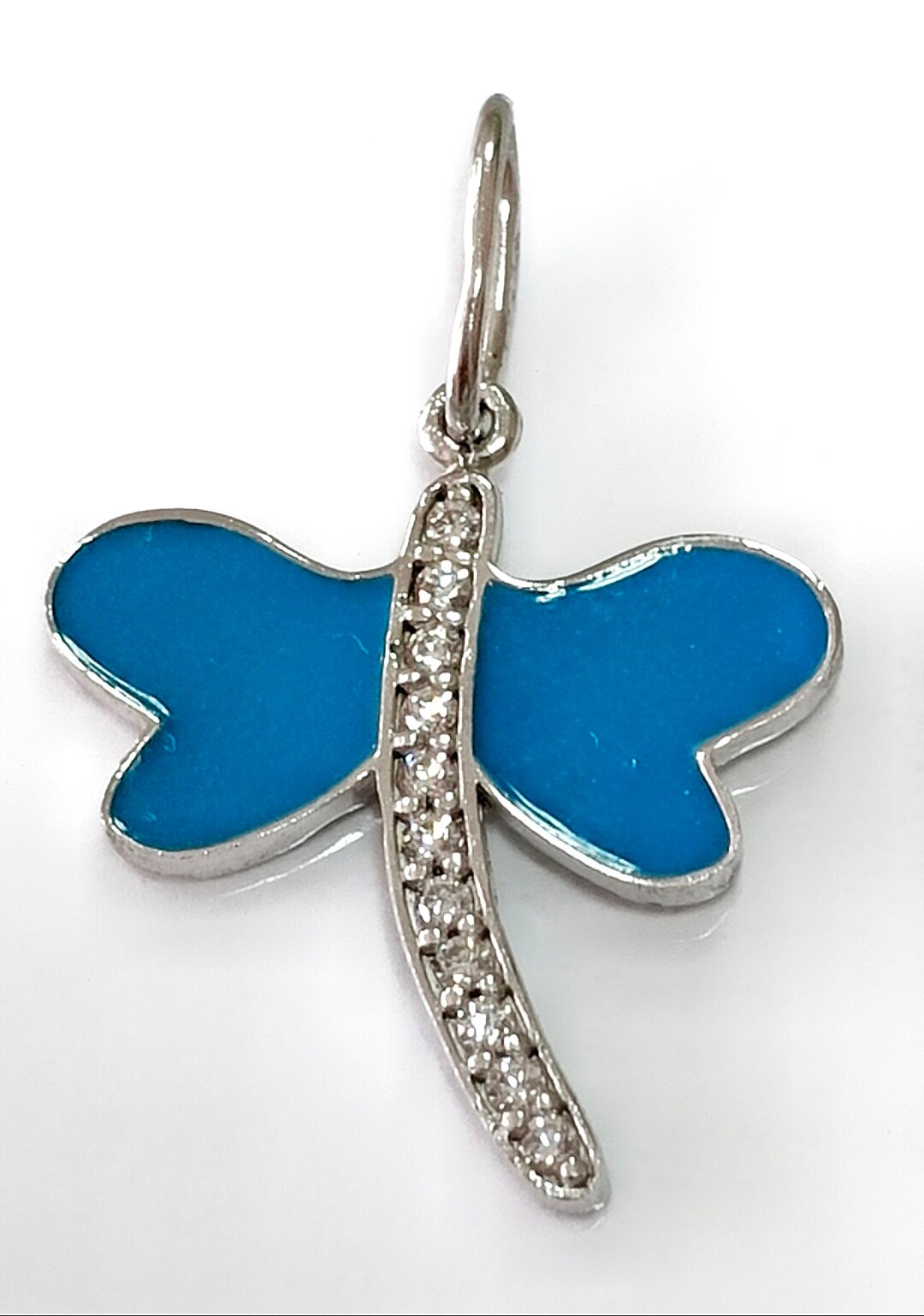 Вставка из голубой эмали и фианитов добавляет изысканности и шарма. Форма вставки в виде крыла бабочки придает украшению неповторимый стиль и оригинальность.