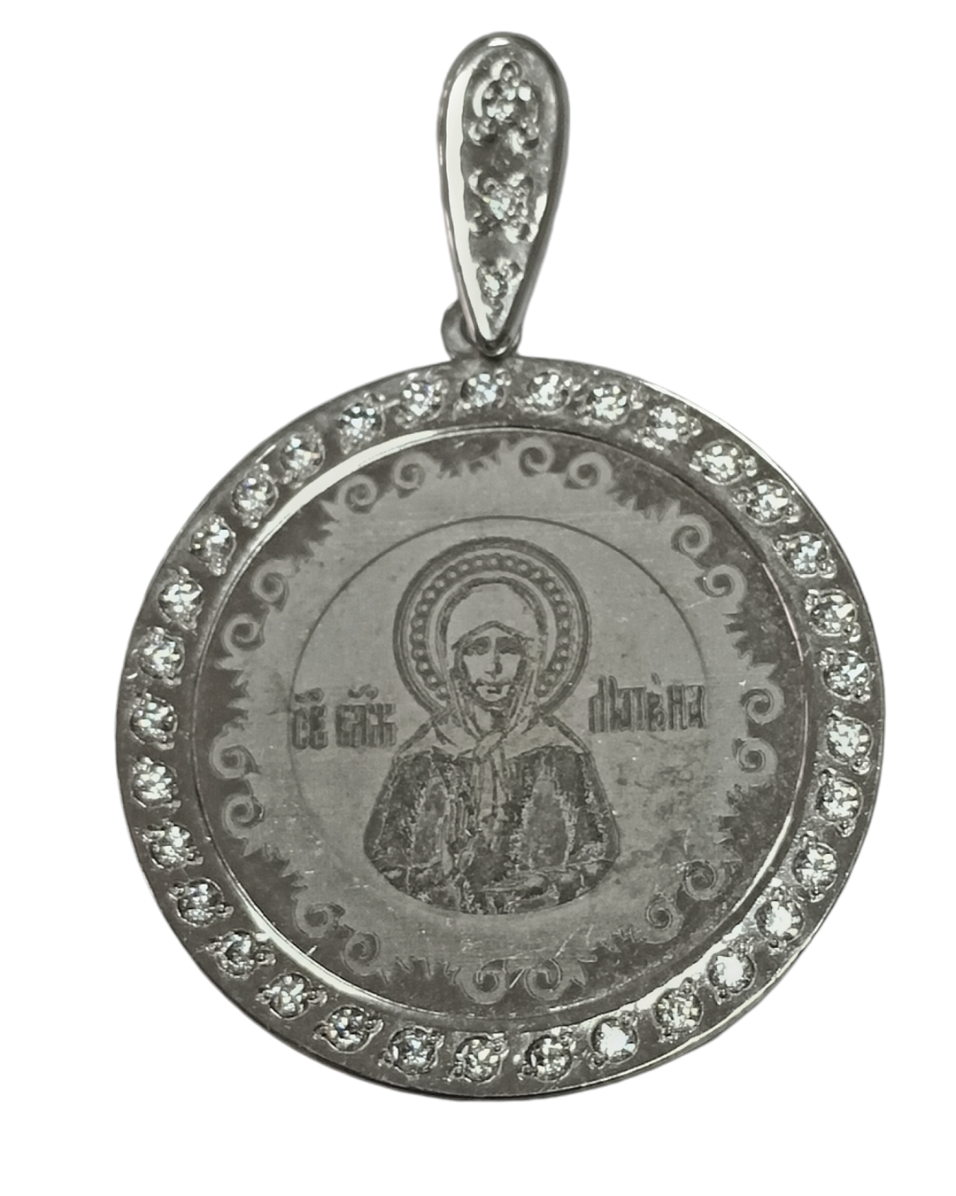 Подвеска имеет православную тематику и украшена гравировкой с надписью "Святая Матрона", что делает ее отличным выбором для верующих женщин.
