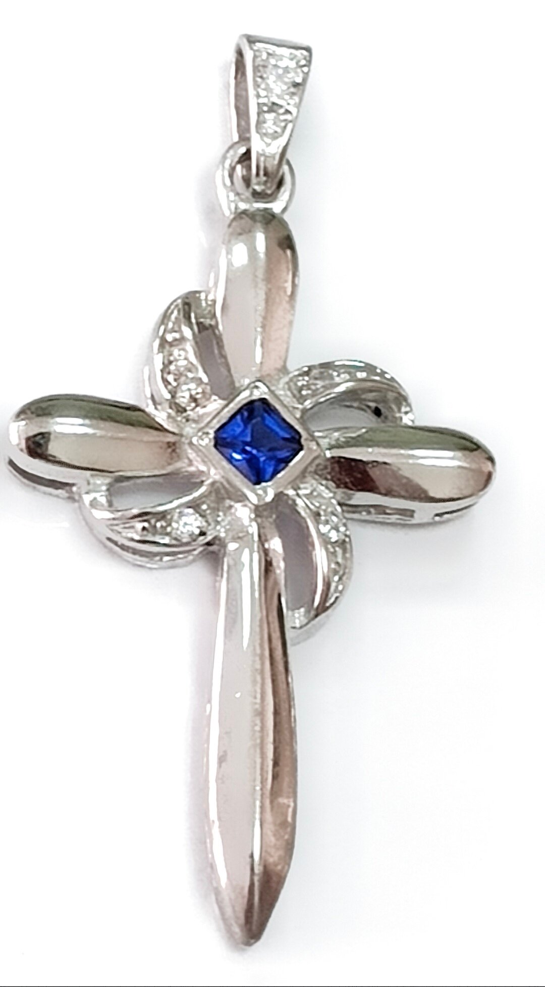 Украшение имеет уникальный дизайн в виде креста, который символизирует веру, надежду и любовь. Подвеска украшена вставками из синей шпинели и фианитов, что придает ей особый шарм и блеск.