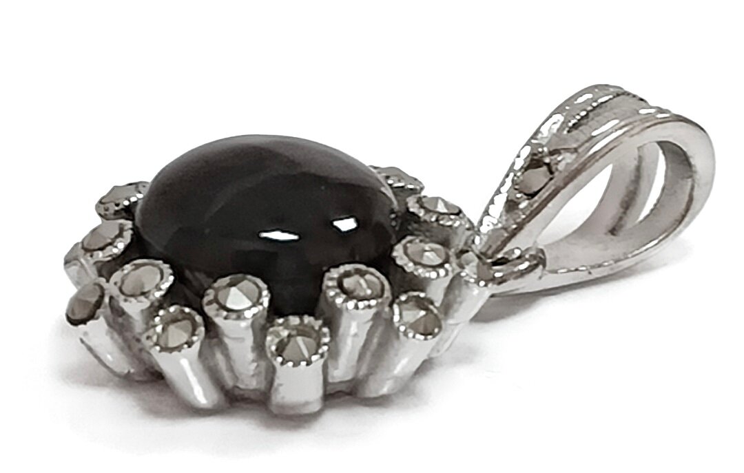 Уникальность подвески подчеркивается двумя вставками - пиритом и ониксом. Пирит - это минерал, который обладает магическими свойствами и считается символом удачи. Оникс - это камень, который приносит своему владельцу мудрость и силу.