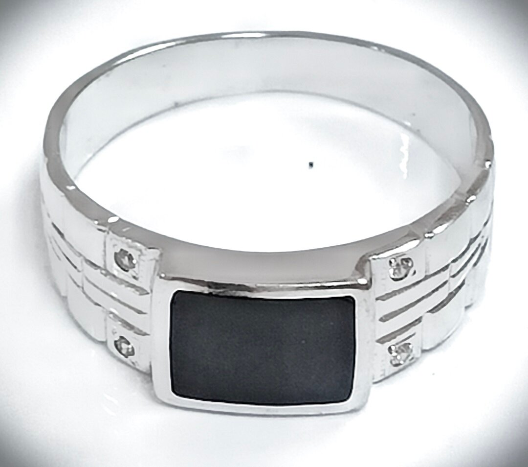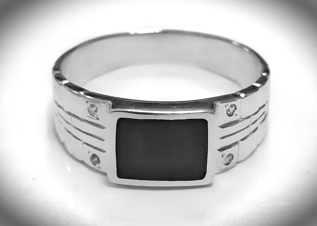 Вставка из фианита и оникса добавляет изделию блеска и роскоши. Фианит в форме квадрата подчеркивает геометрию кольца, а оникс добавляет ему таинственности и загадочности.