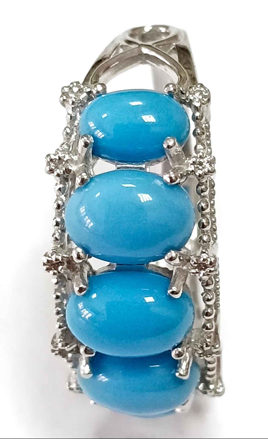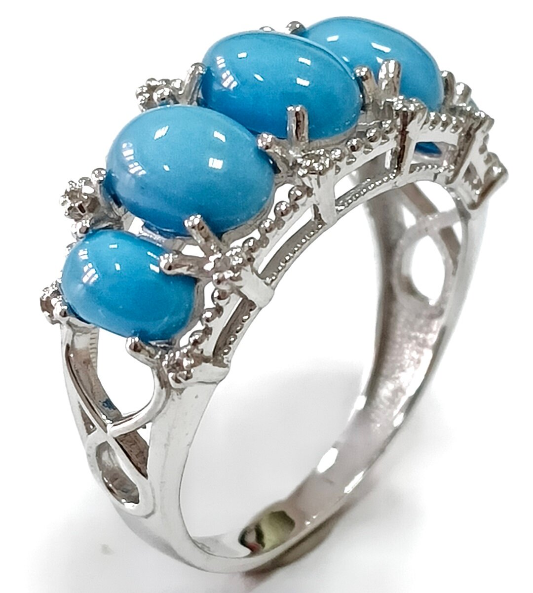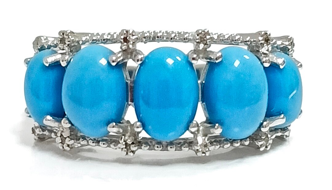 Вставка из синтетической бирюзы и фианитов придает кольцу неповторимый блеск и сияние. Бирюза, благодаря своей уникальной форме кабошон, создает эффект глубины и объема, а фианиты добавляют изделию изысканности и блеска.