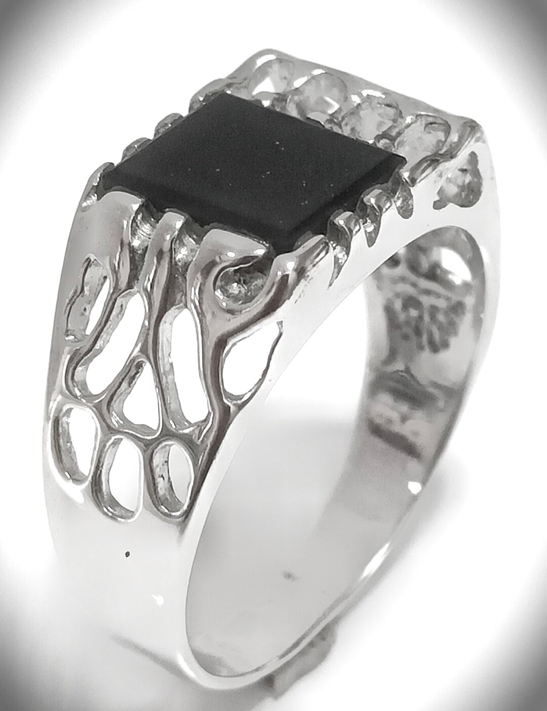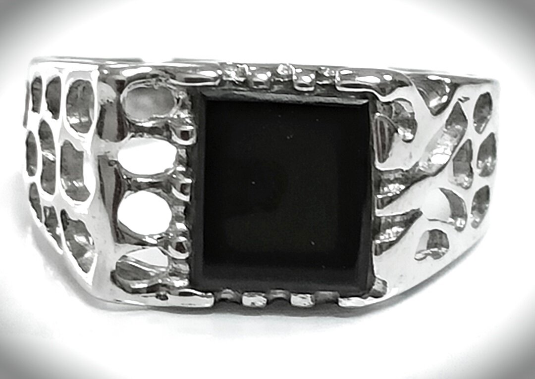 Имитированный оникс в качестве вставки придает кольцу особый шарм и изысканность. Квадратная форма вставки и отделка родированием придают изделию блеск и глубину цвета.