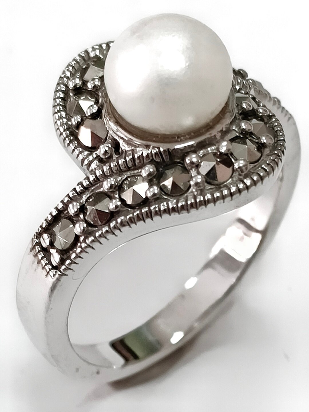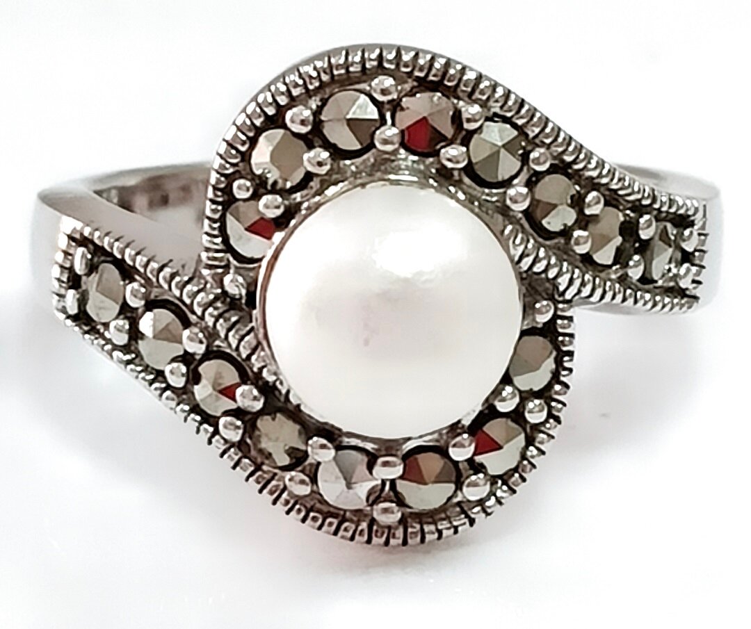 Вставка из культивированного жемчуга придает кольцу изысканный вид. Пирит, еще одна вставка, добавляет изделию оригинальность и загадочность.