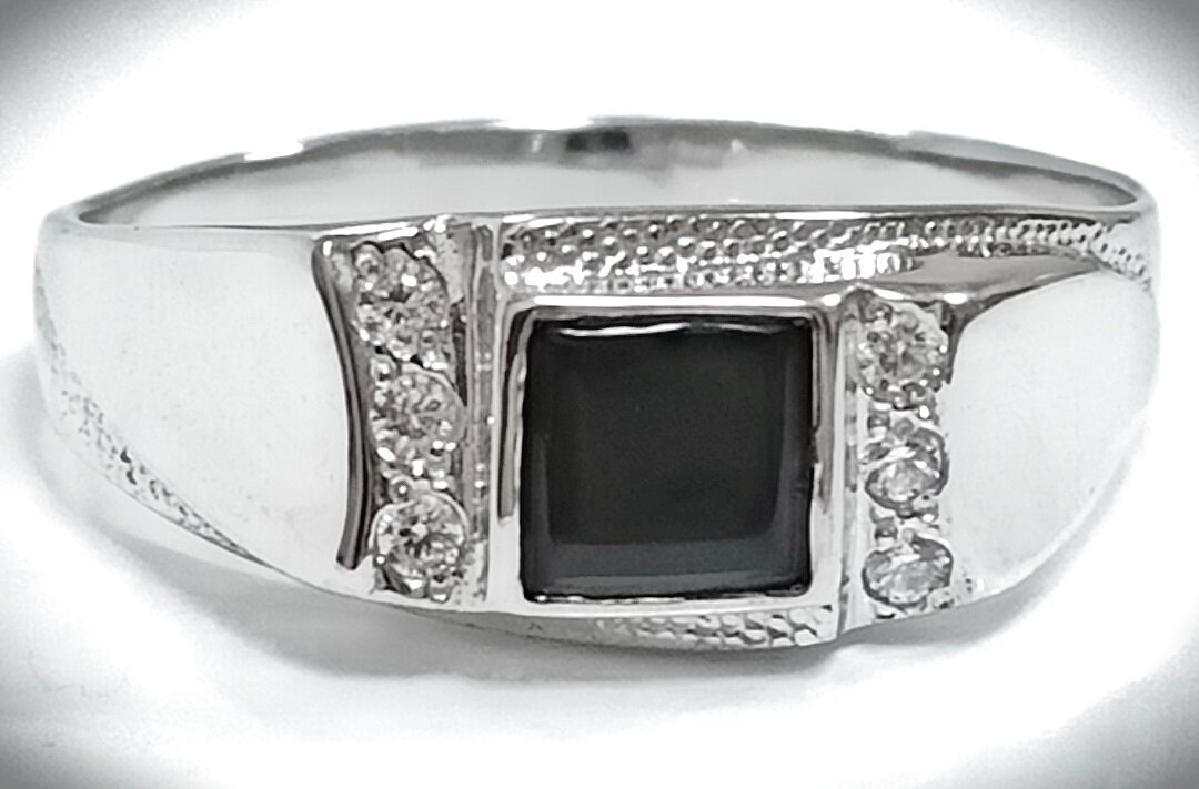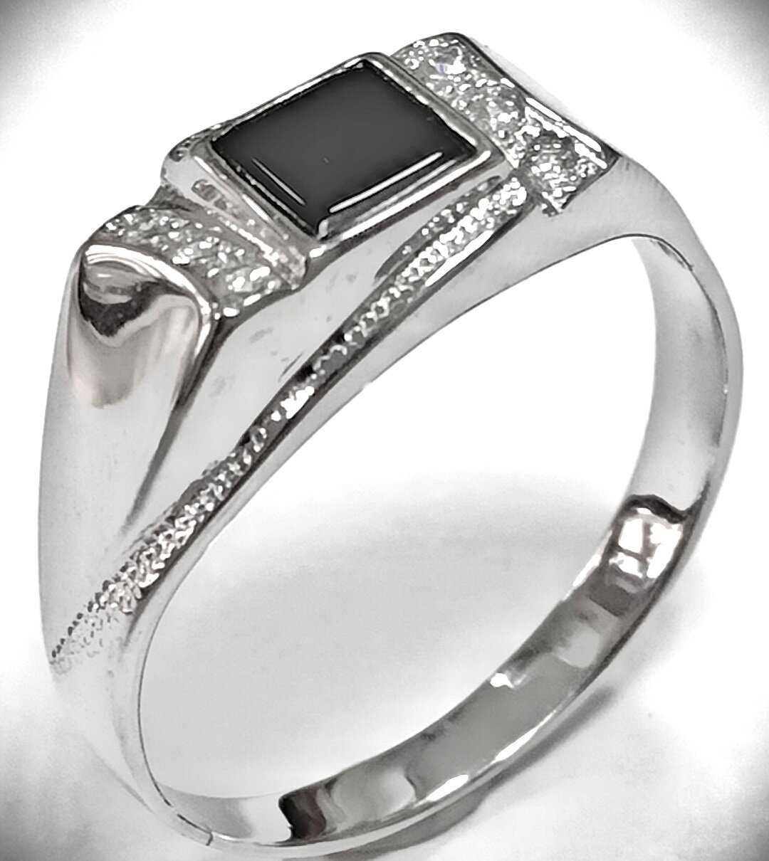 Печатка украшена двумя вставками - ониксом и фианитом. Оникс - это полудрагоценный камень, который придает изделию особый шарм и глубину. Фианит - это синтетический камень, который обладает ярким блеском и долговечностью.