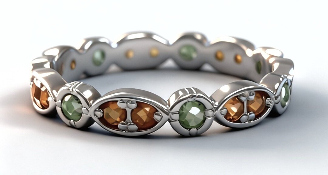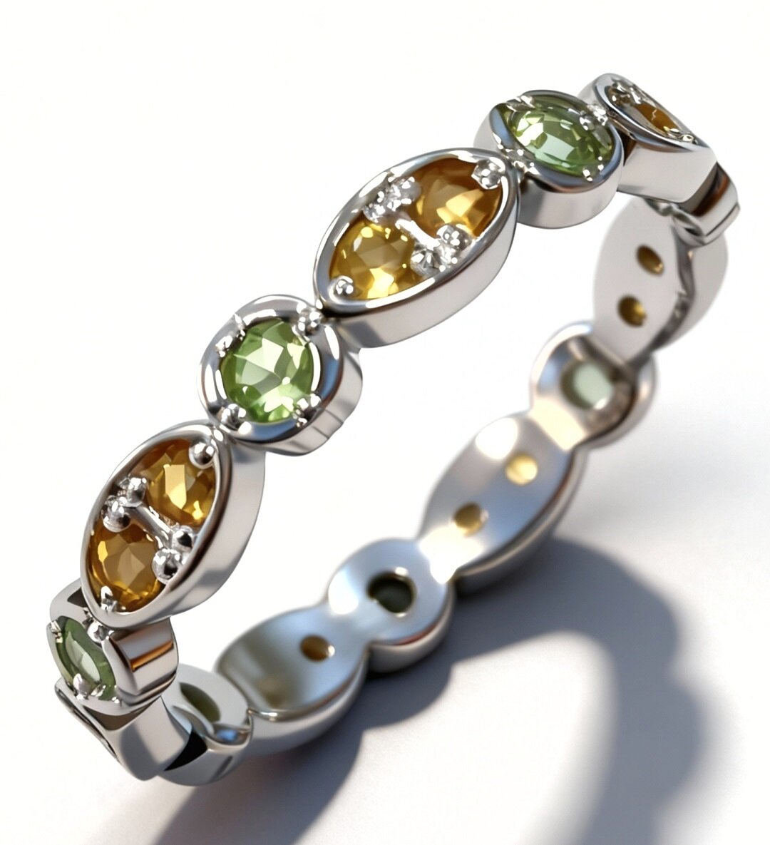 Вставка цитрина и хризолита придает кольцу особый шарм и изысканность. Эти камни известны своими яркими и насыщенными цветами, которые будут привлекать внимание и подчеркивать ваш стиль.