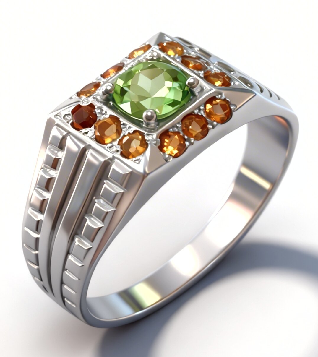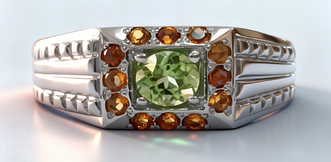Вставка цитрина и хризолита придает кольцу особый шарм и блеск. Эти камни известны своими яркими и насыщенными цветами, которые будут привлекать внимание и подчеркивать ваш стиль.