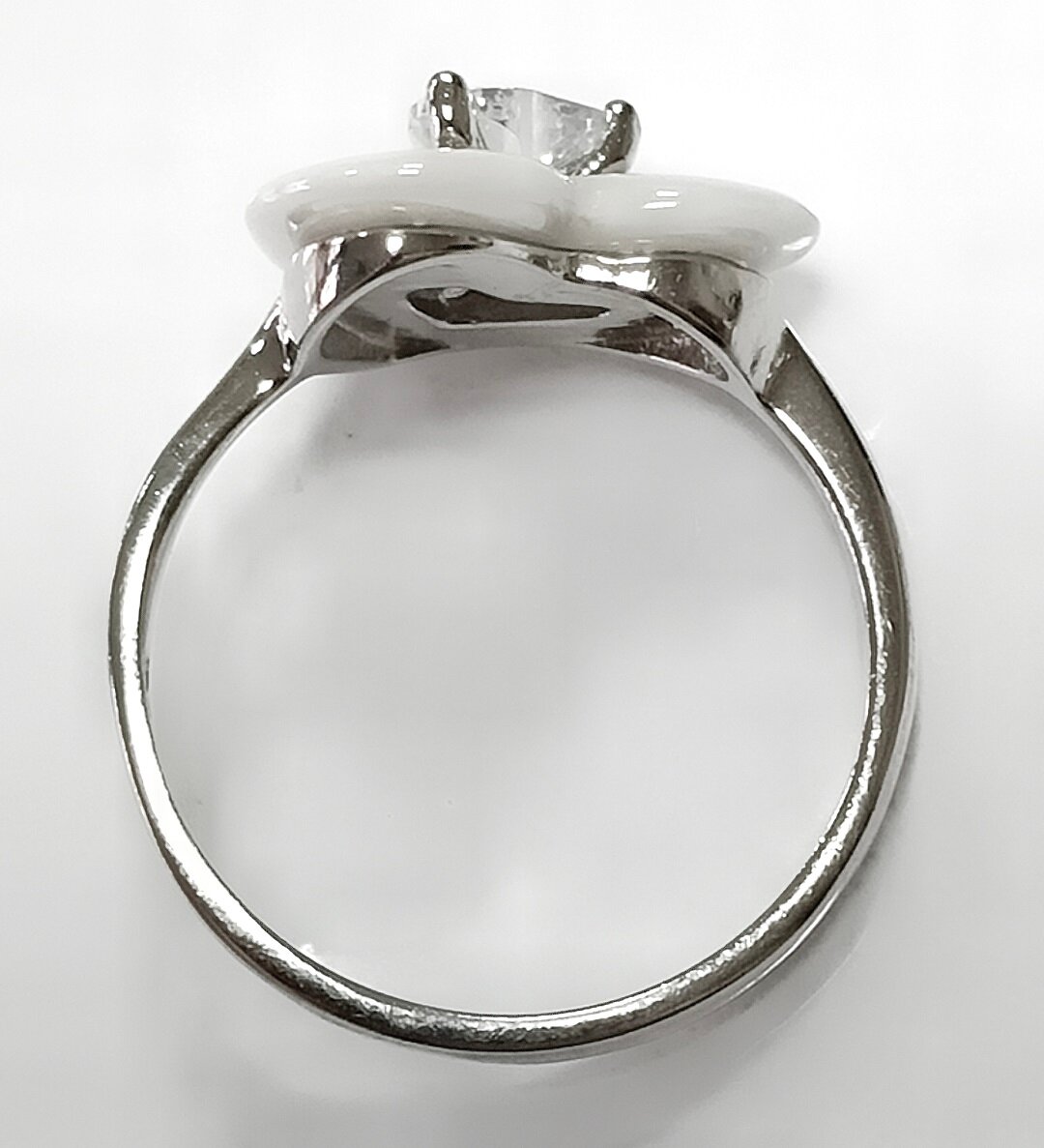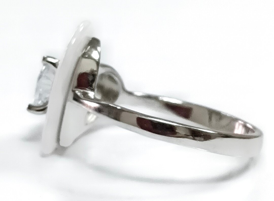 Вставка из белой керамики в форме сердца и круга добавляет оригинальности и уникальности дизайну кольца. Фианиты, расположенные вокруг керамики, придают изделию блеск и сияние.