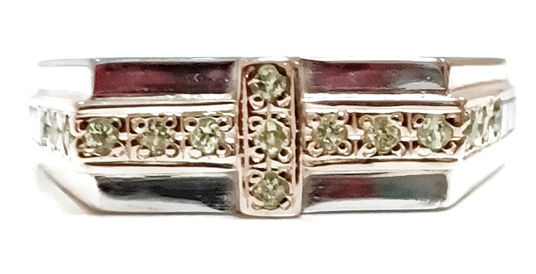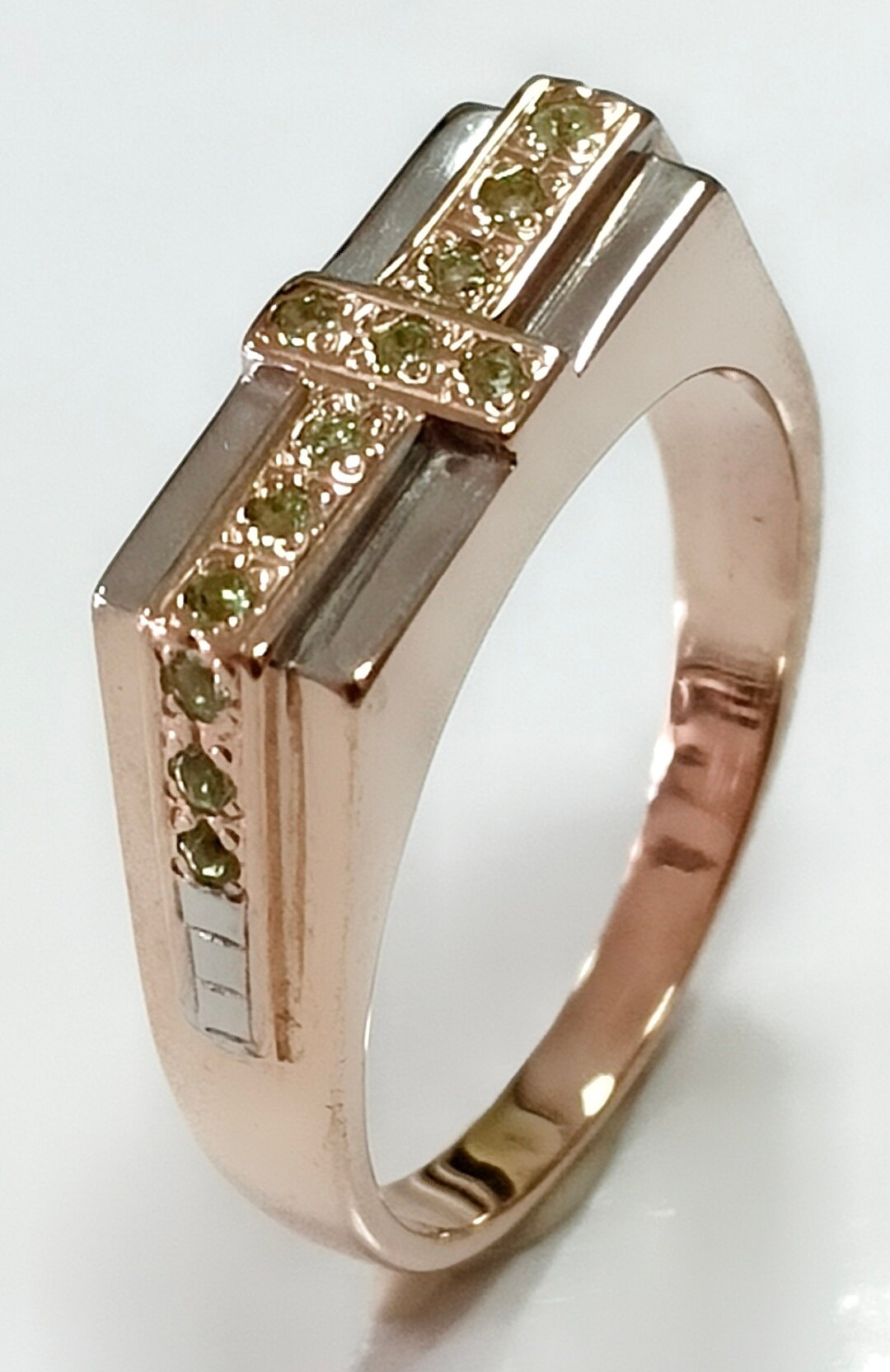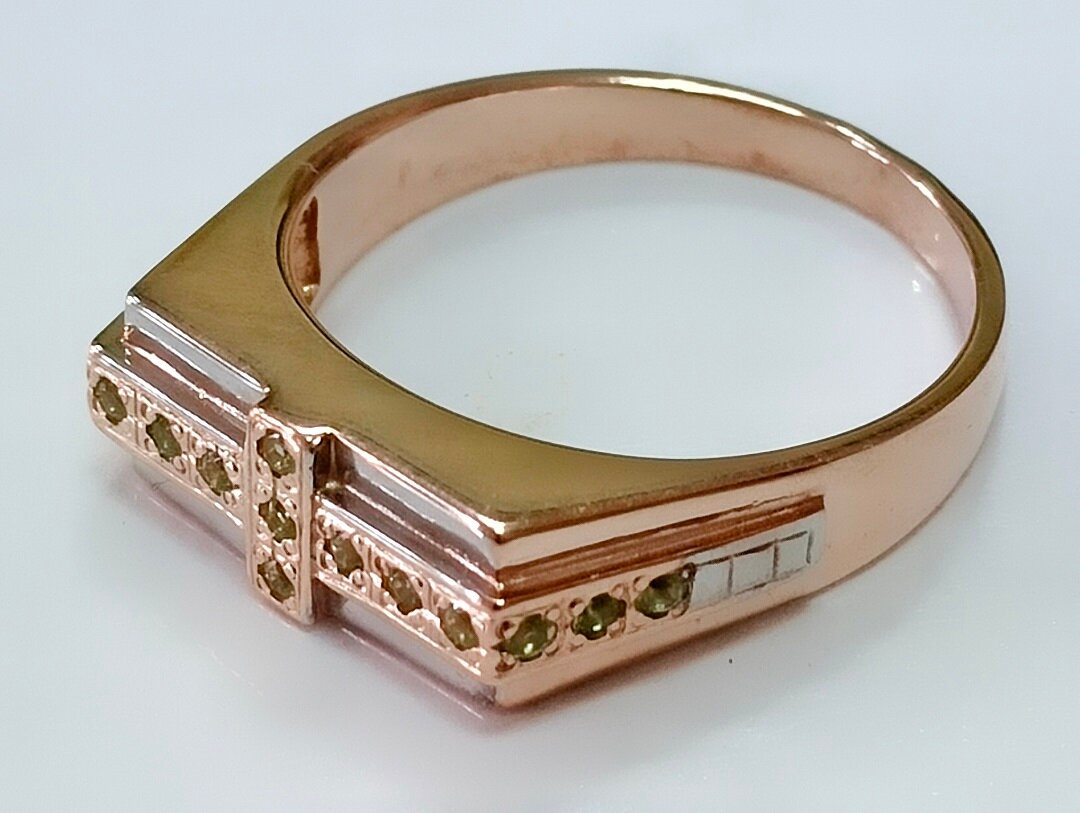 Вставка из хризолита придает кольцу особый шарм и изысканность. Хризолит - это полудрагоценный камень, который обладает уникальной способностью усиливать энергетику владельца и приносить удачу.