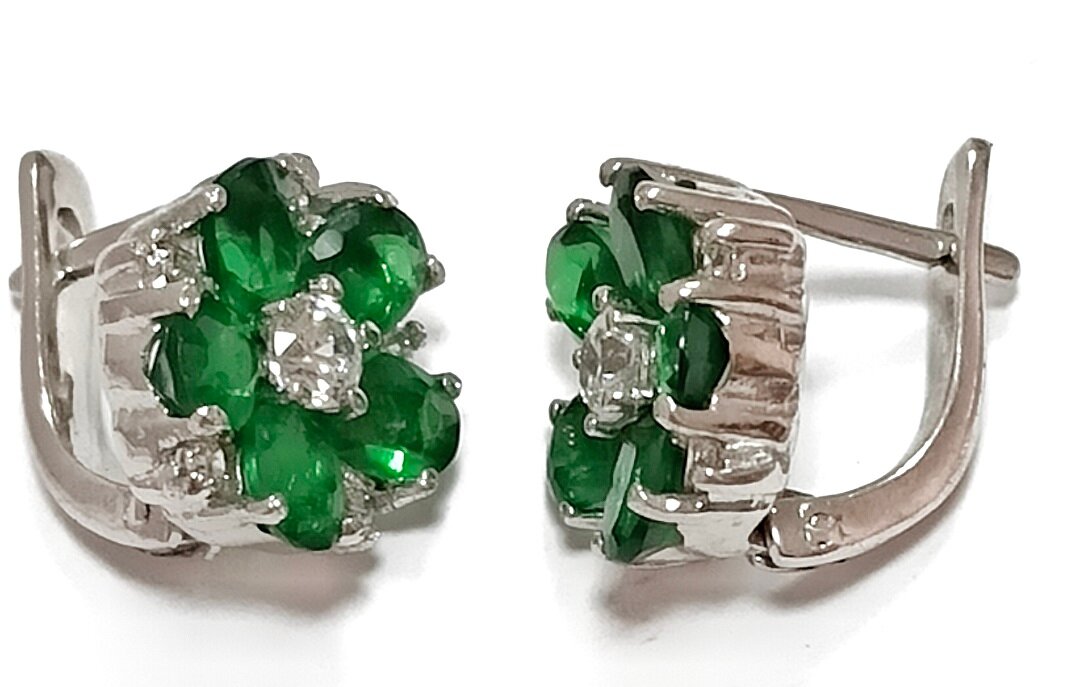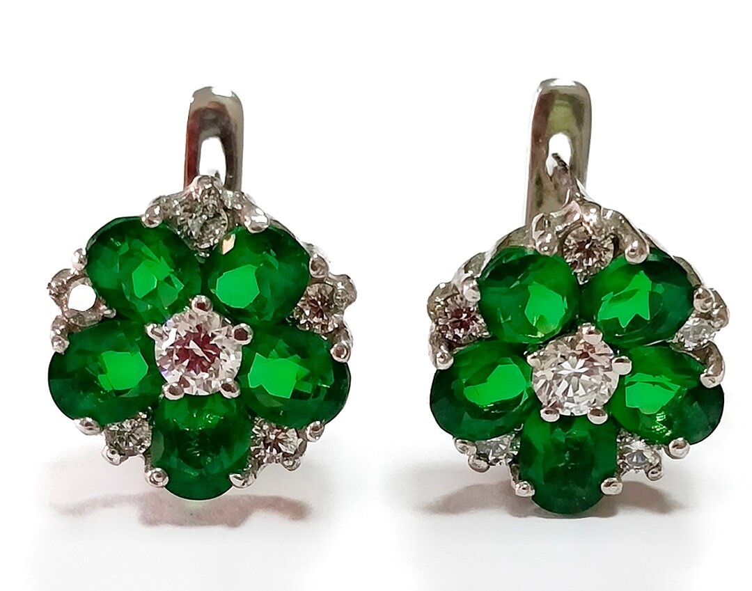 Серьги украшены вставками из зеленого и белого фианита, которые придают изделию неповторимый блеск и сияние. Форма вставок – круг, что делает украшение еще более привлекательным и стильным.