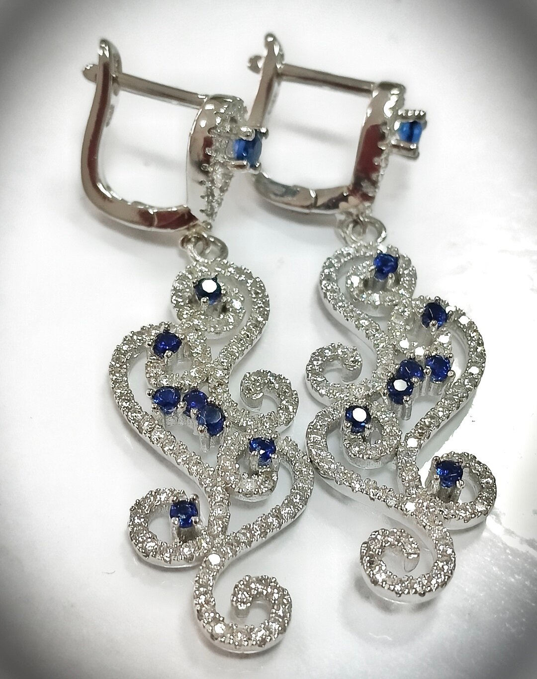 Серьги выполнены в коллекции Эстерелла, которая сочетает в себе элегантность и ажурность. Вставка из синего фианита придает украшению особый шарм и блеск.