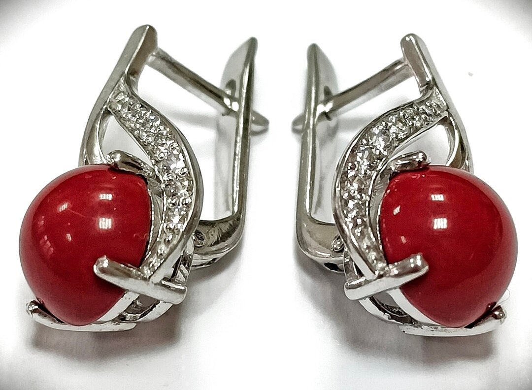 Серьги украшены вставками из синтетического коралла и фианита. Коралловые вставки круглой формы добавляют изделию элегантности и роскоши, а фианиты придают ему блеск и сияние.