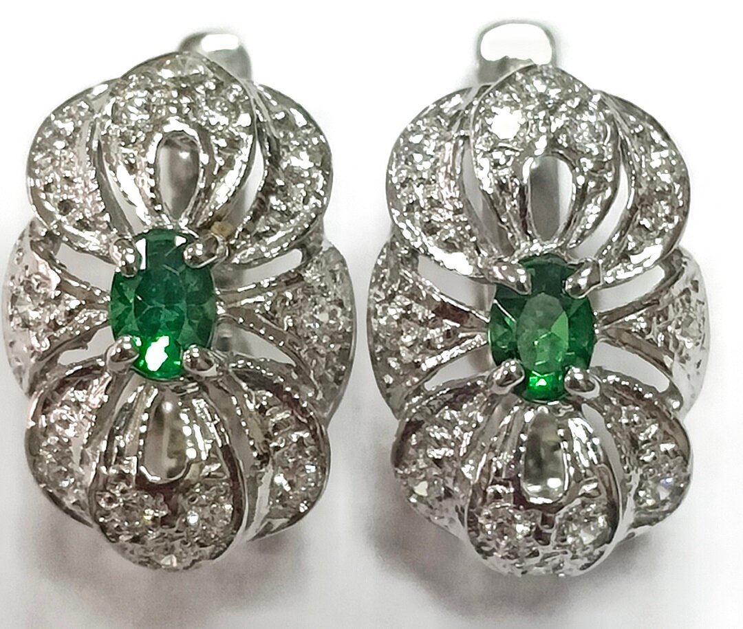 Серьги украшены двумя видами вставок - зеленым и белым фианитом овальной формы. Фианиты - это синтетические камни, которые обладают ярким блеском и долговечностью. Благодаря этому, серьги Эстерелла выглядят элегантно и дорого.