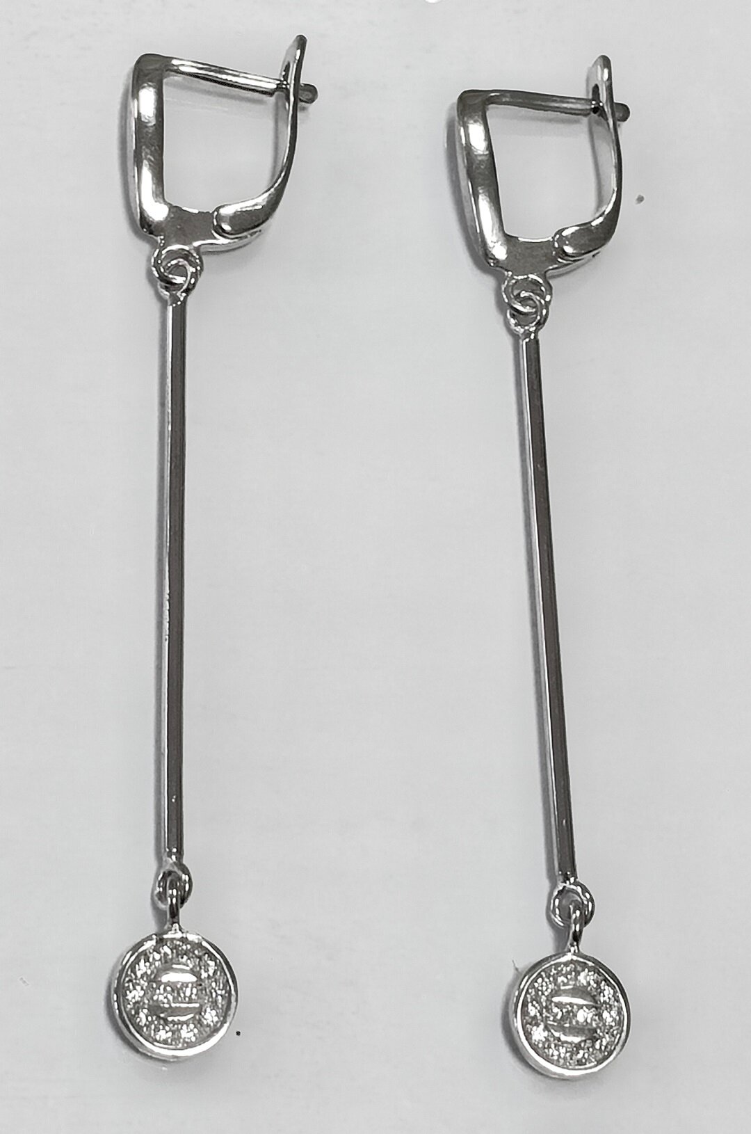 Модель с подвесками украшена вставками из фианита круглой формы. Фианит – это синтетический камень, который по своим свойствам не уступает природному бриллианту, но при этом имеет более доступную цену.